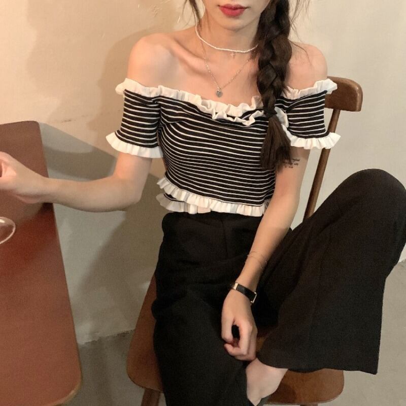 ストライプTシャツ サマートップス 夏物 ブラックストロベリース27679542531