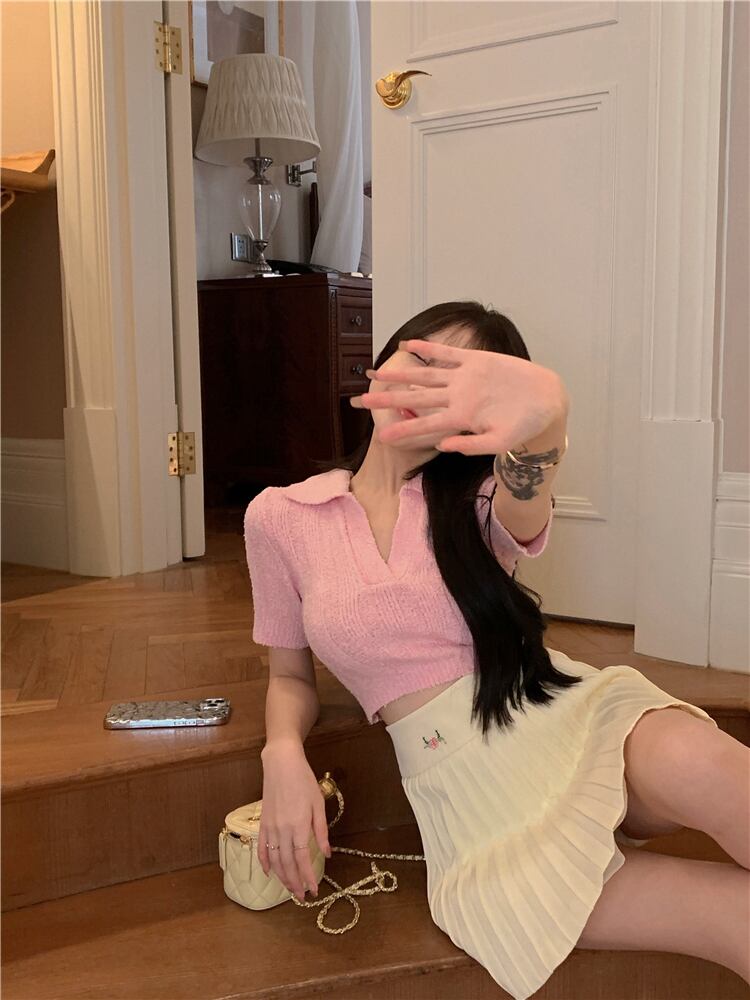 ニットプリーツスカート サマーAラインショートハイウェストウェスト薄手ホワイト 大人ガーリー スウィート キュート カジュアル 夏物 ブラックストロベリース29574068319