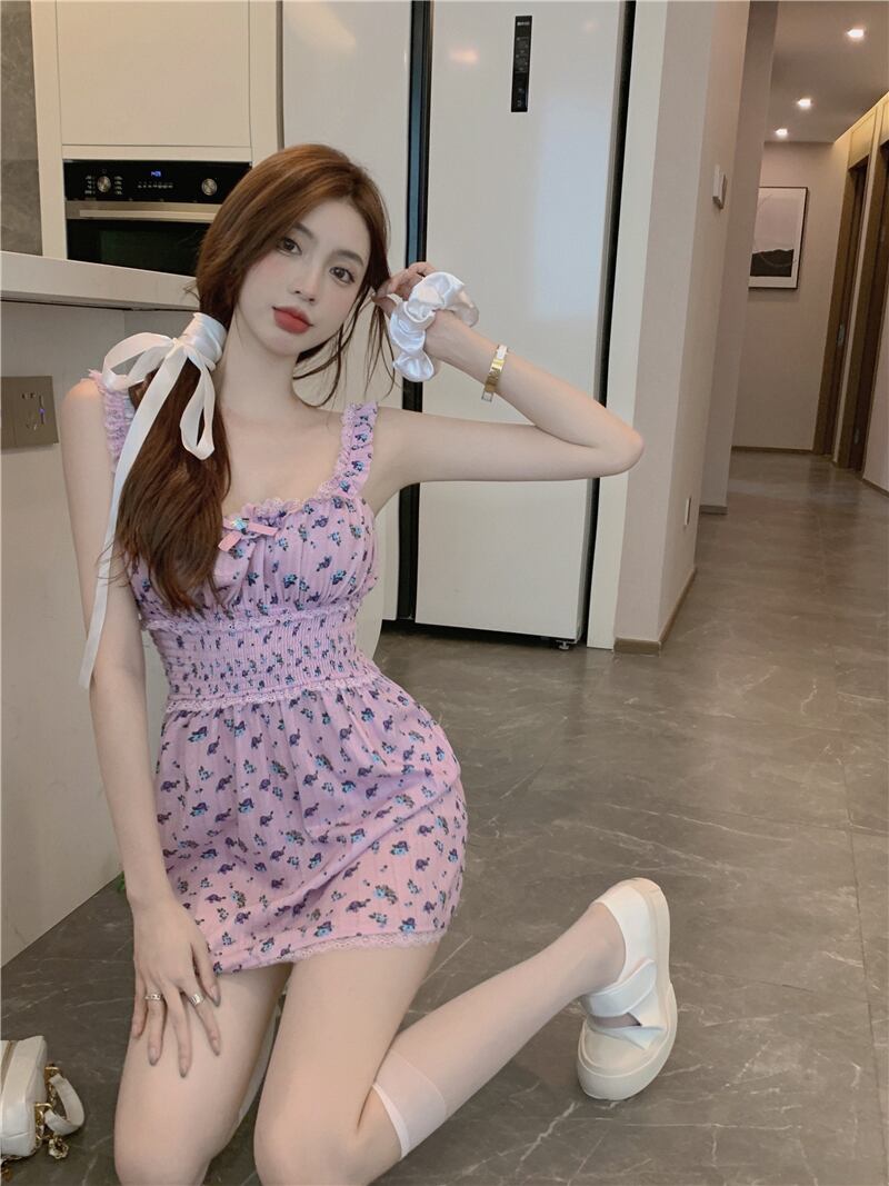 フローラルドレス レースリボンバックレスショートスカート サマー 夏物 花柄 パープル ブラックストロベリース59073881569