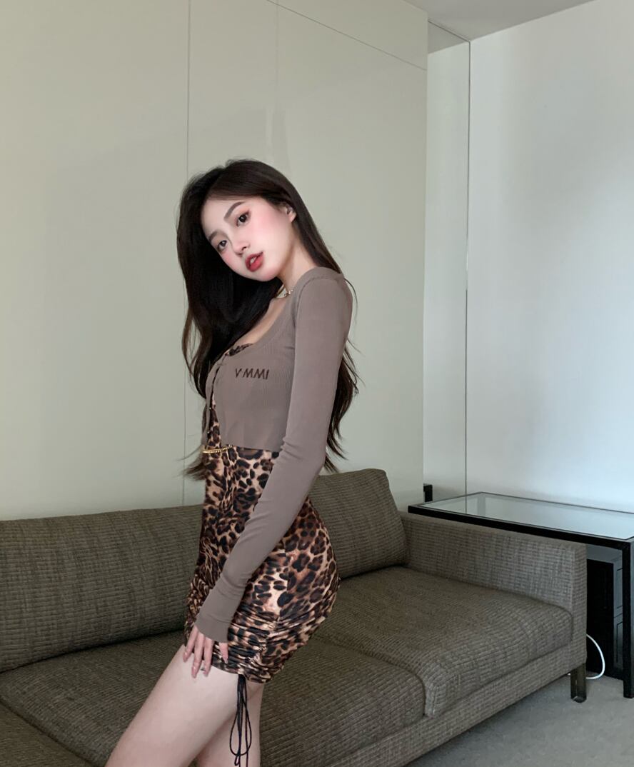 レオパードプリント柄トップス ドレス ウェストショートスカート サマー 夏物 ヨーロピアン ブラックストロベリース79383561499