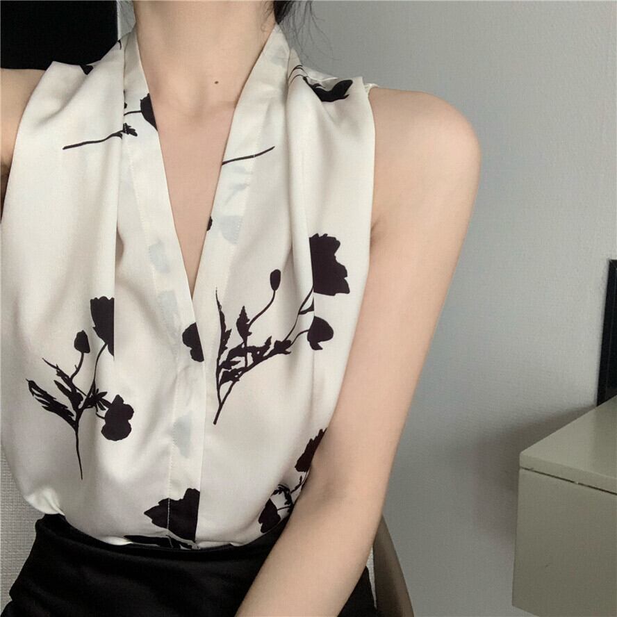 シャツ Flowerデザイン プリント柄ノースリーブサマースタンダードホワイトルーズトップス レトロ 夏物 フラワーデザイン ブラックストロベリース78986722999