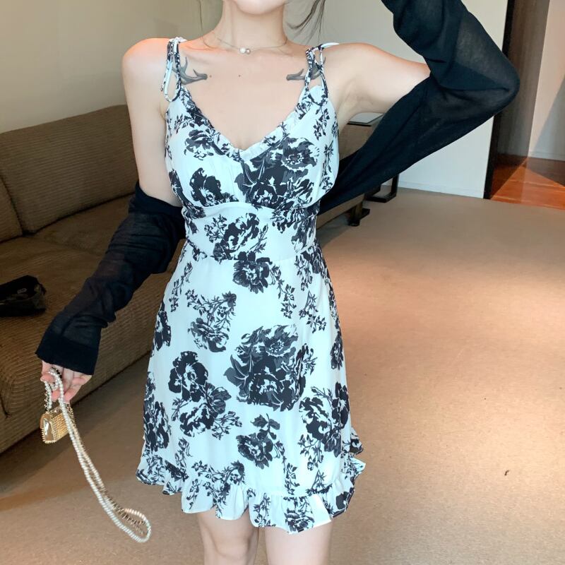 フローラルドレス ウェストショートスカート サマー 夏物 花柄 ピュア ブラックストロベリース97913612761