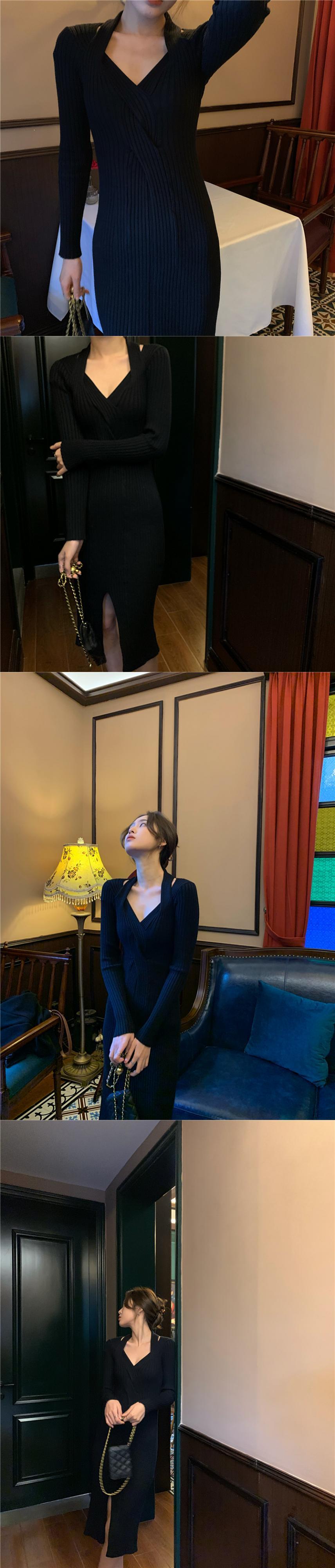 ドレス Vネックホルターブラックウェストスリムミディスカート スプリング ロング 春物 ブラックストロベリース6041454503
