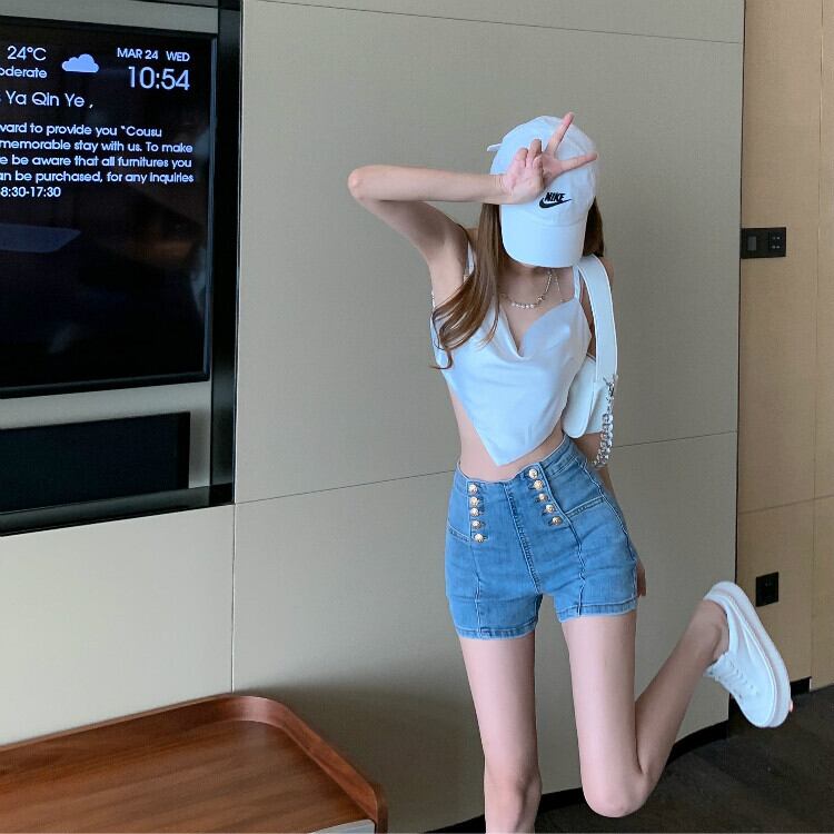 ジーンズ ハイウェストウェストスリムショーツ サマーパンツ 薄手 夏物 ブルマー ブラックストロベリース26520255591