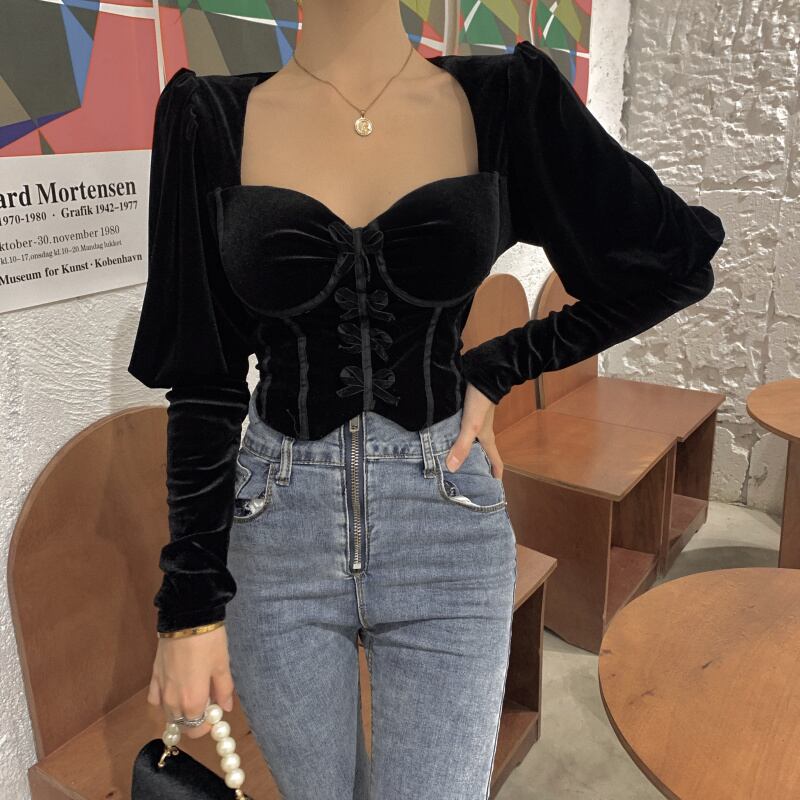 Tシャツ シャツ スリーブショートスリムブラックゴールドベルベットスプリングオータムトップス ロング 春物 秋物 ブラックストロベリース85637935835