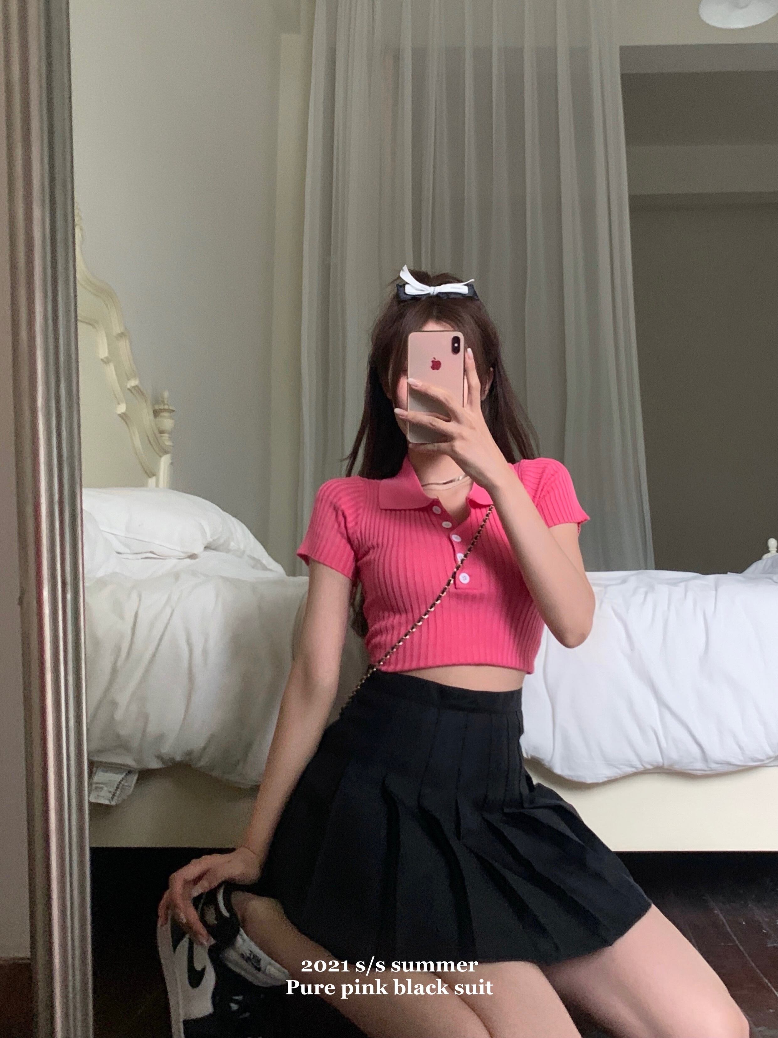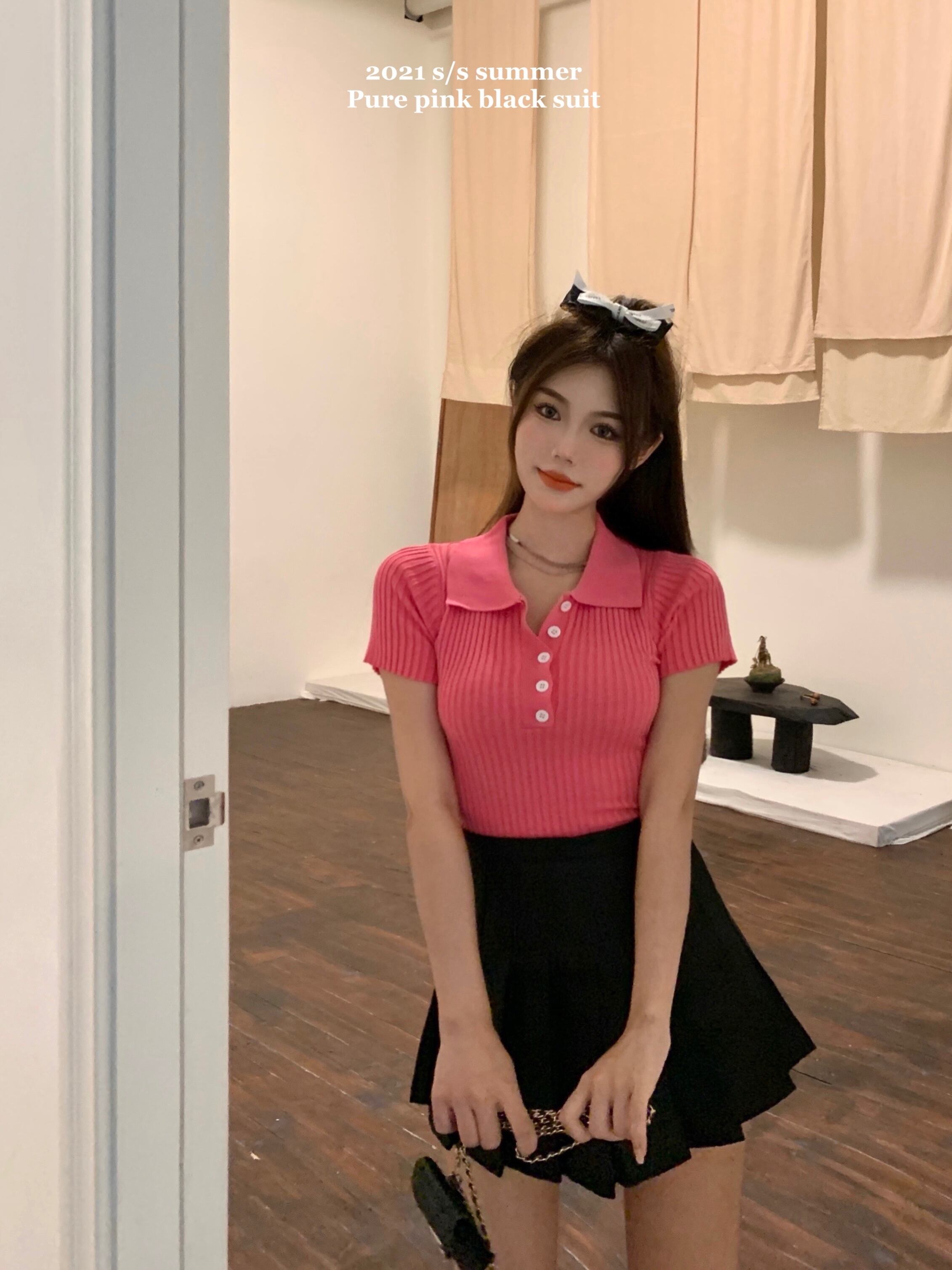 レッドカラーニットTシャツ サマースタイルスリムトップス 大人ガーリー スウィート キュート カジュアル 夏物 ピュア ブラックストロベリース79597217686
