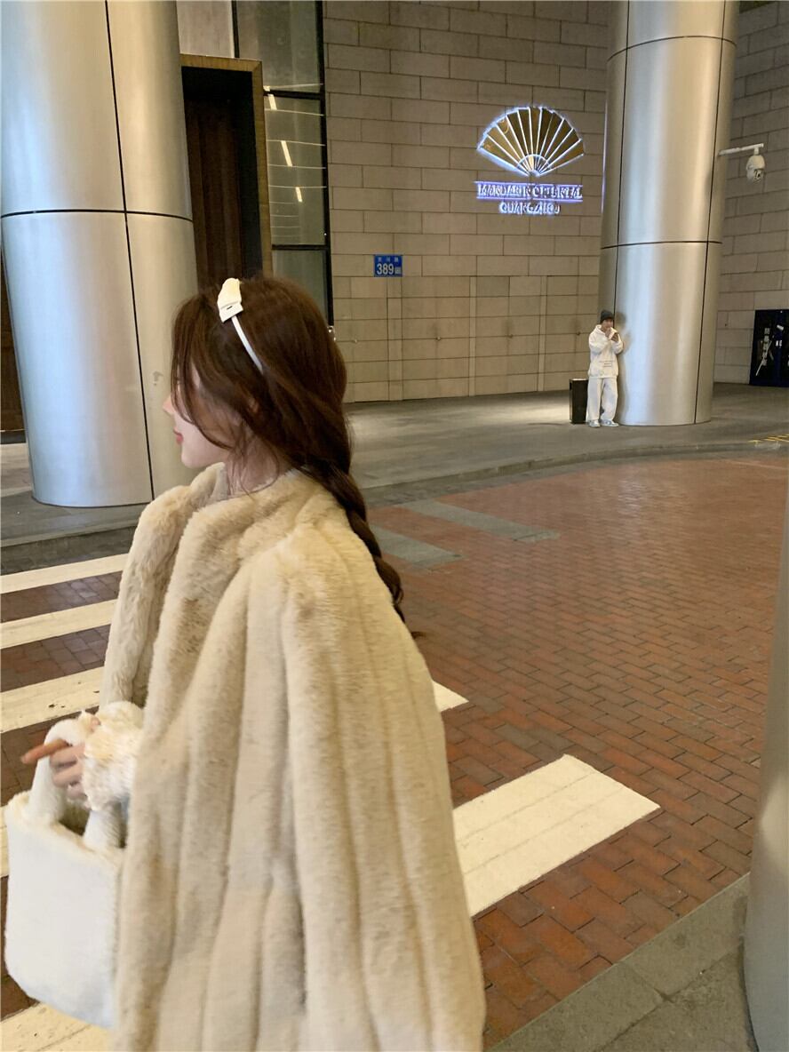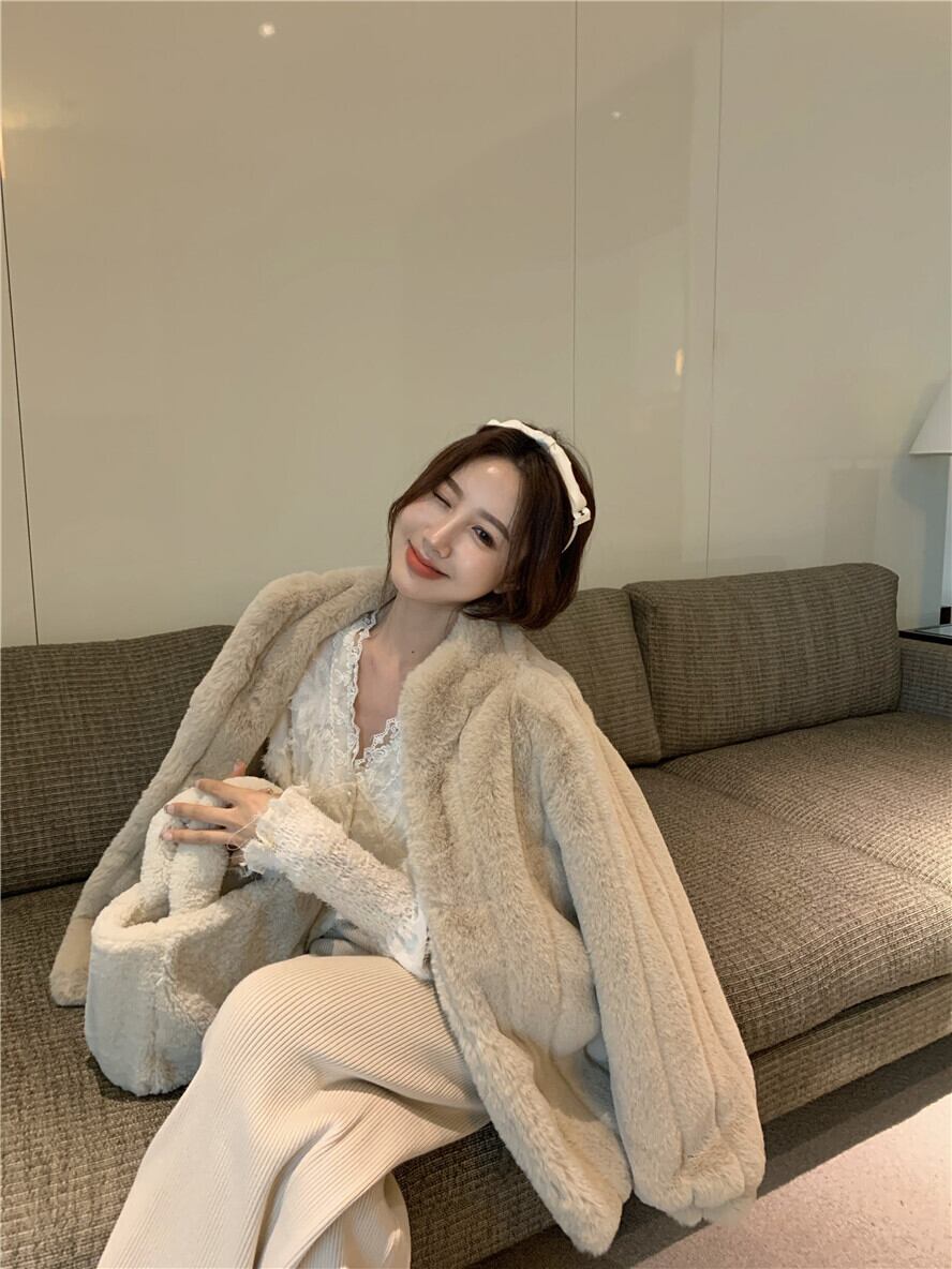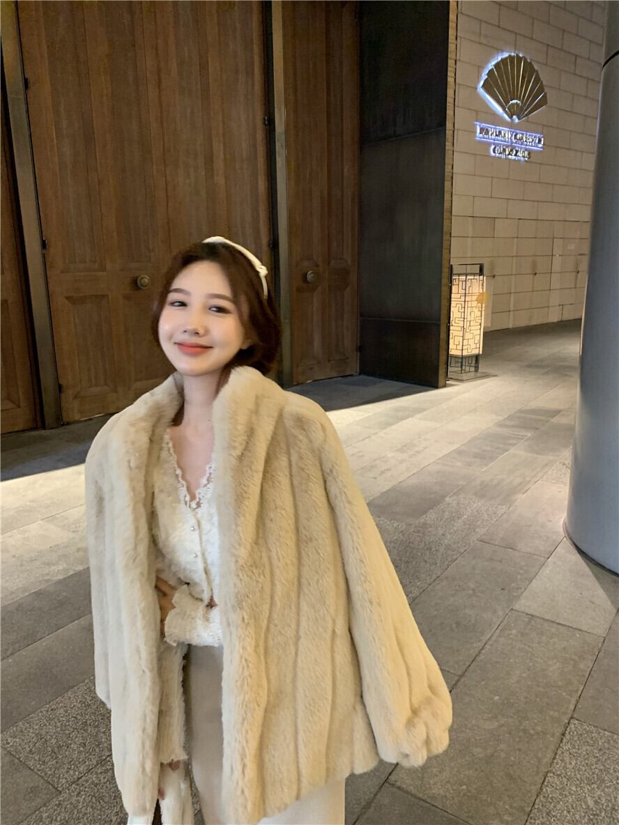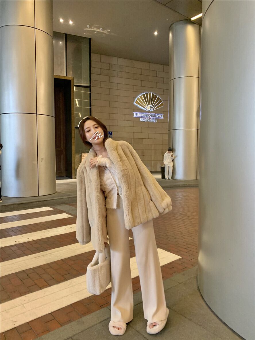 色:ベージュのファーコート,レースのアプリコット,ウールの厚手のパンツ