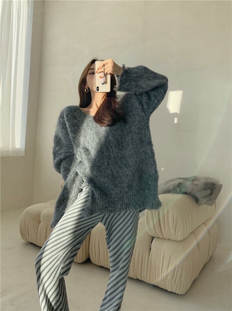 セーター レディースルーズグレーVネックニットスプリングオータムプルオーバー トップス 春物 秋物 ブラックストロベリース20214363853