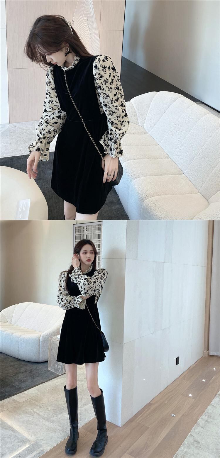 ドレス スタンダードフローラルスカート スプリング ロング レトロ 春物 花柄 ステッチ ブラックストロベリース80023539343