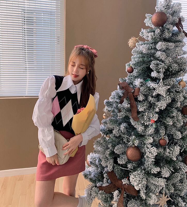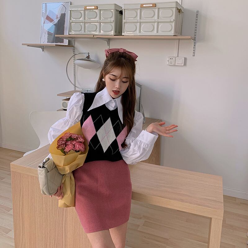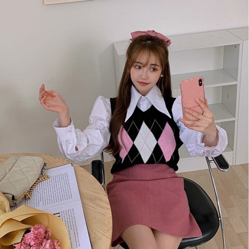 色:ダイヤモンドニットベスト,ピンクのスカート,白いパフスリーブシャツ