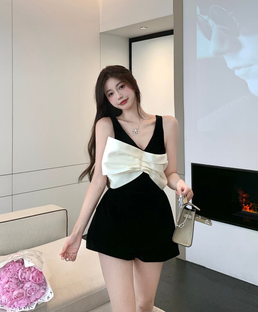 スタンダードリボンジャンプスーツ オールインワン サマー薄手ショーツ ワイドレッグ レトロ 夏物 ブルマー ワイドパンツ ブラックストロベリース89632992472