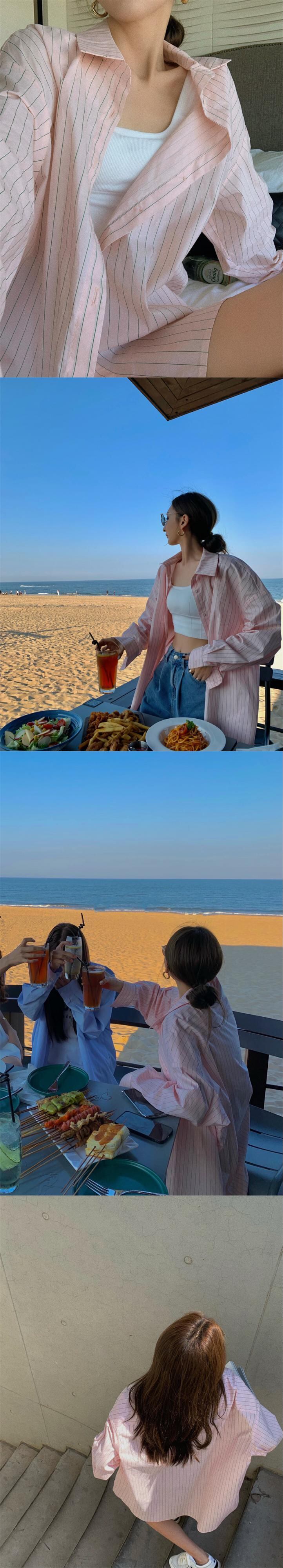 スタイルストライプルーズシャツ ジャケット レディースサマー薄手 ロング ピンク 夏物 ブラックストロベリース3119563348