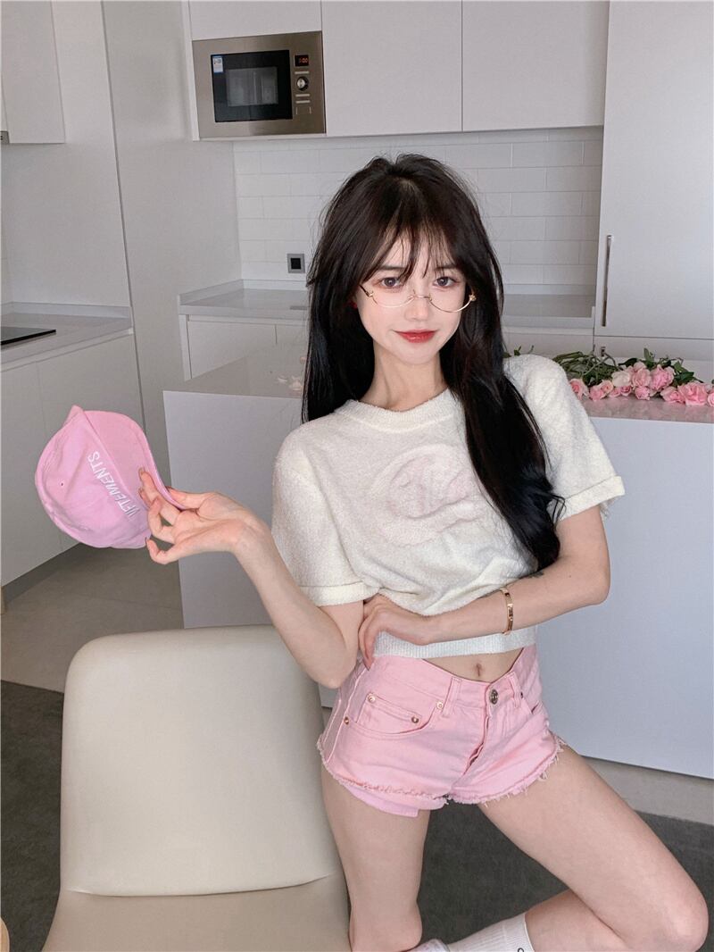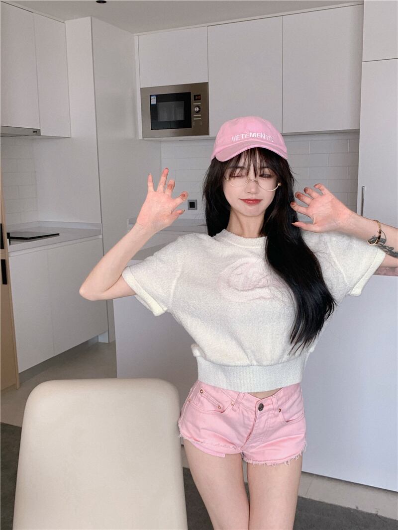 ニットTシャツ サマーショートホワイトスリムラウンドネックトップス 大人ガーリー スウィート キュート カジュアル 夏物 Oネック ブラックストロベリース41476481206