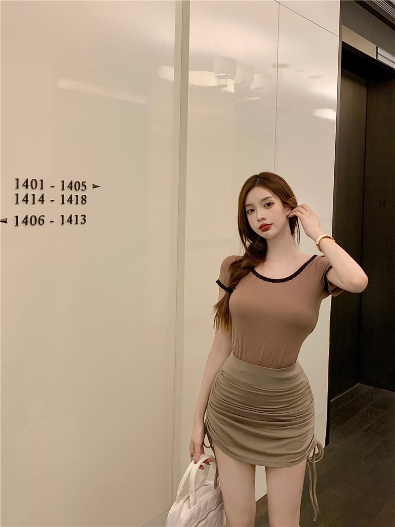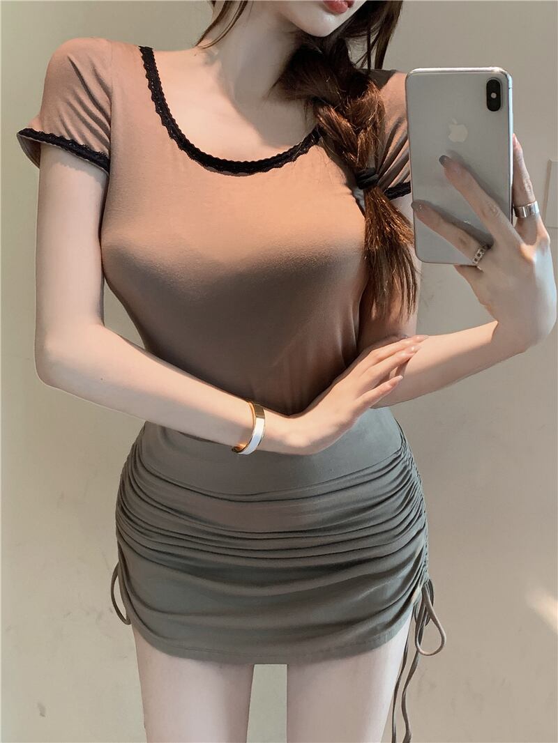 ブラックシャツ 半袖スリーブTシャツ レディース薄手ギャザーサマースカート ショート ハーフスリーブ 夏物 ブラックストロベリース87375477265