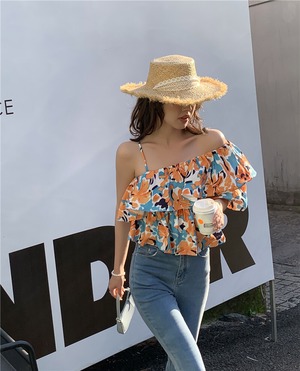 フローラルシャツ サマーショートトップス 夏物 花柄 オフショルダー ブラックストロベリース58037326819