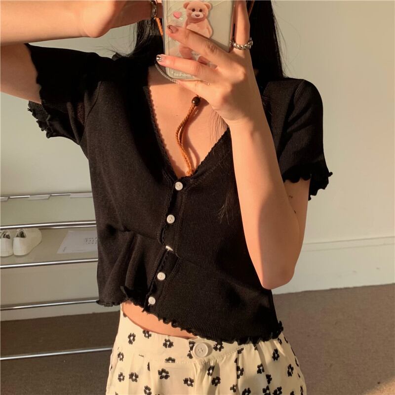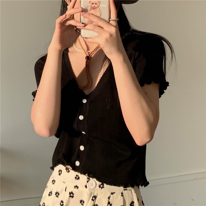 ニットカーディガンサマーショートトップス ピンク 夏物 ブラックストロベリース7598360986