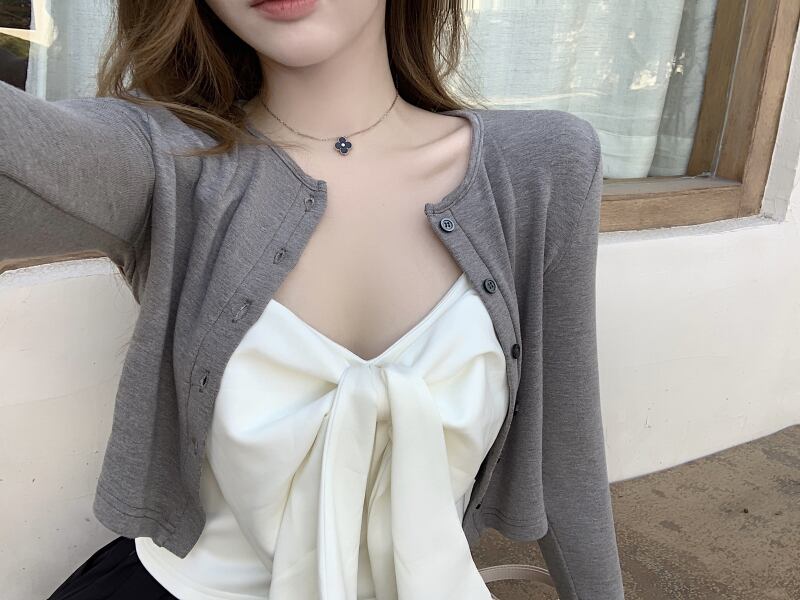 色:グレーのカーディガン,リボンストラップ,ブラックプリーツスカート