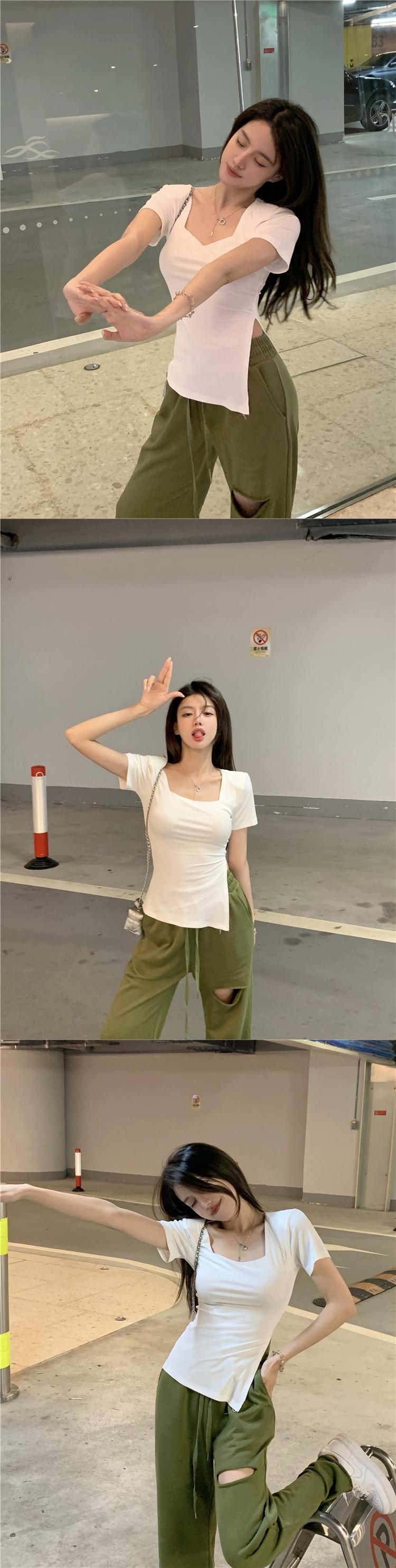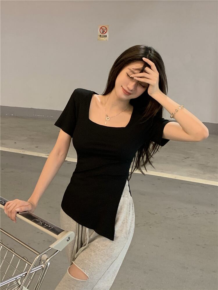 スリットTシャツ サマー薄手ブラックスリムトップス 大人ガーリー スウィート キュート カジュアル 夏物 ブラックストロベリース39817638616