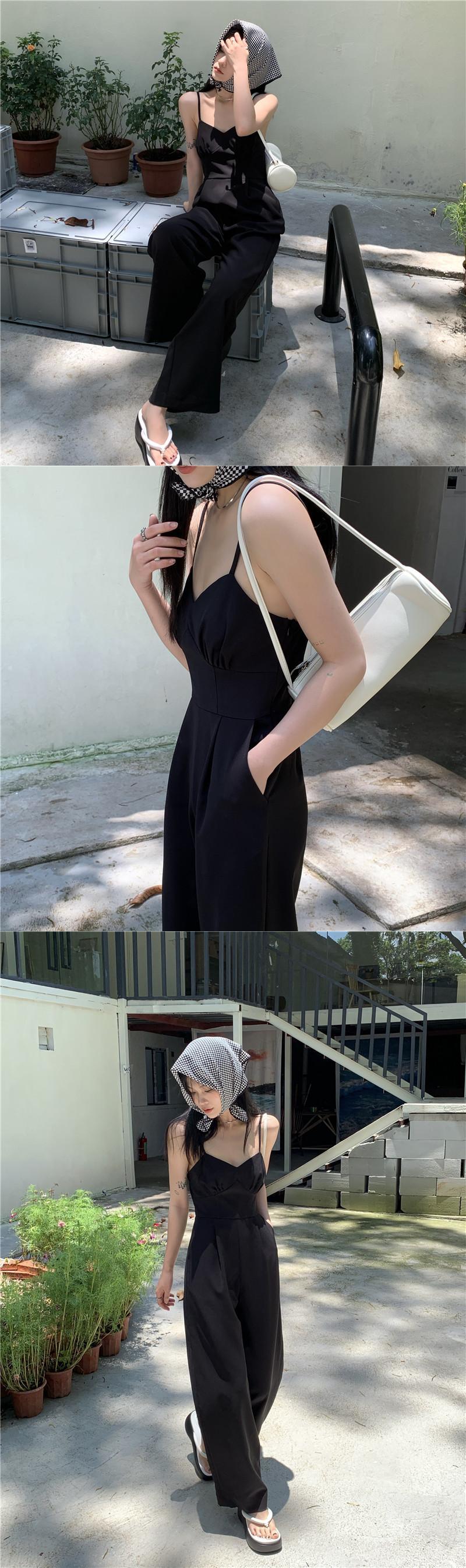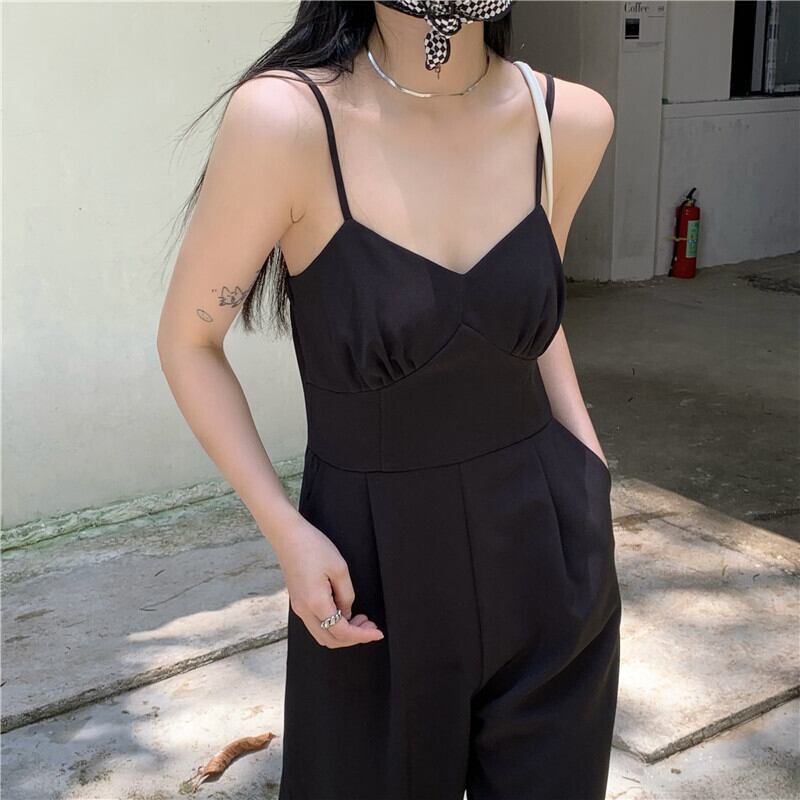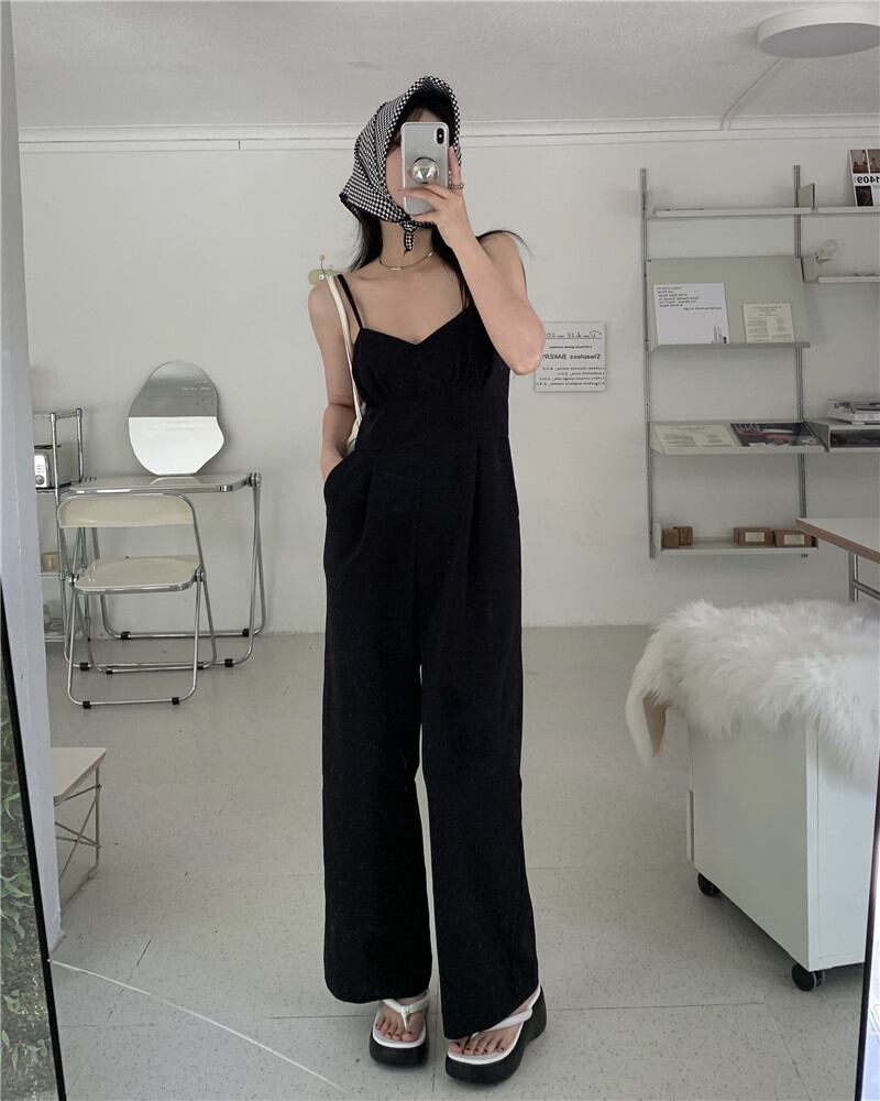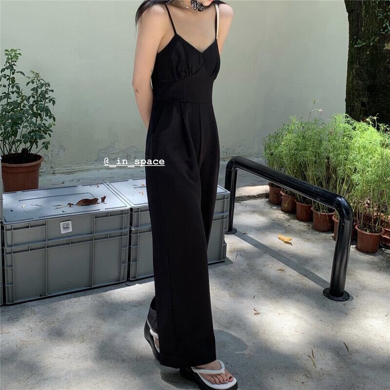 ブラックジャンプスーツ オールインワン サマー薄手ワイドレッグ 夏物 ワイドパンツ ブラックストロベリース67045784116