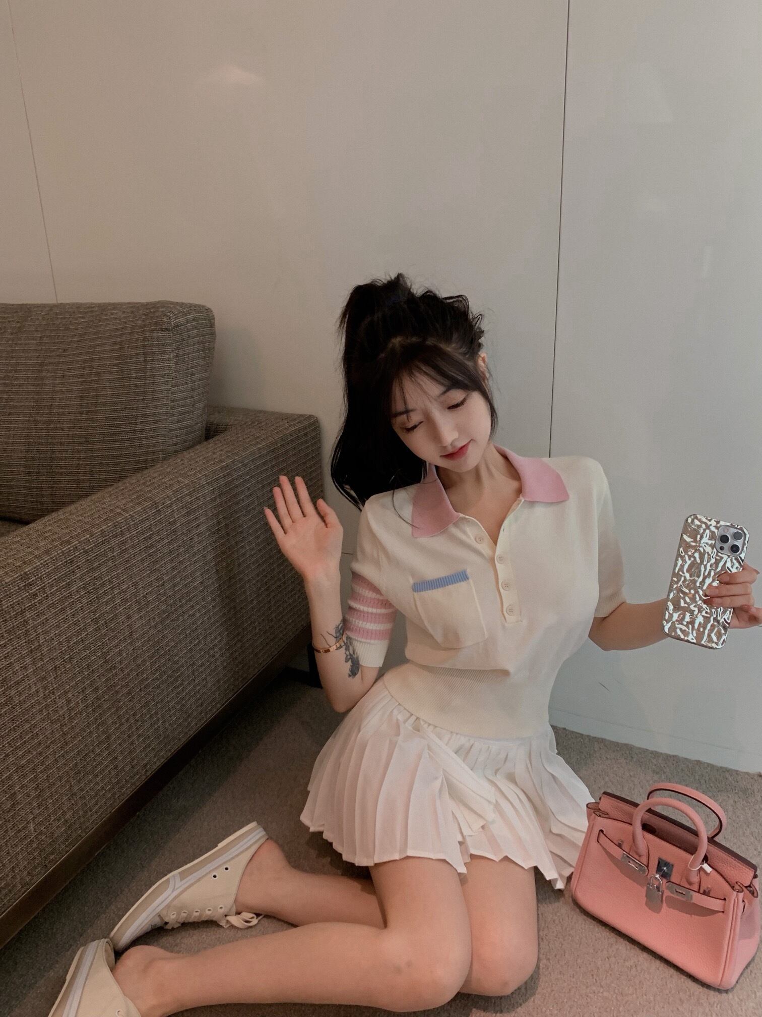 スタイルカラーニットショートTシャツ サマー薄手トップス 大人ガーリー スウィート キュート カジュアル 夏物 ブラックストロベリース41727866279