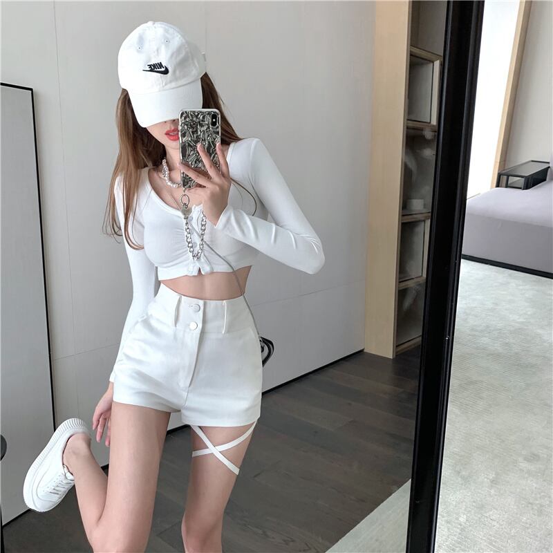 ジーンズ サマー薄手パンツ ホワイトAラインショーツ ハイウェストウェスト レース 夏物 ブルマー レースアップ ブラックストロベリース29159075189