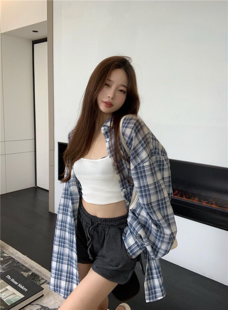 格子柄シャツ ルーズサマースタンダードスタイルトップス ロング レトロ 夏物 ブラックストロベリース41888998404