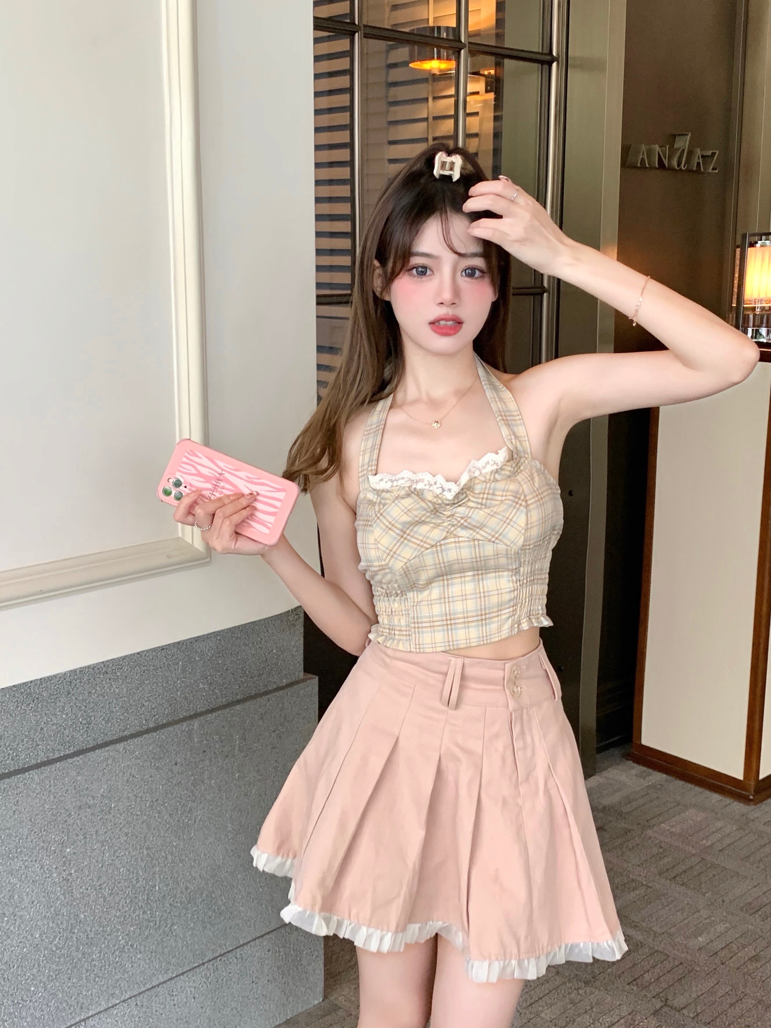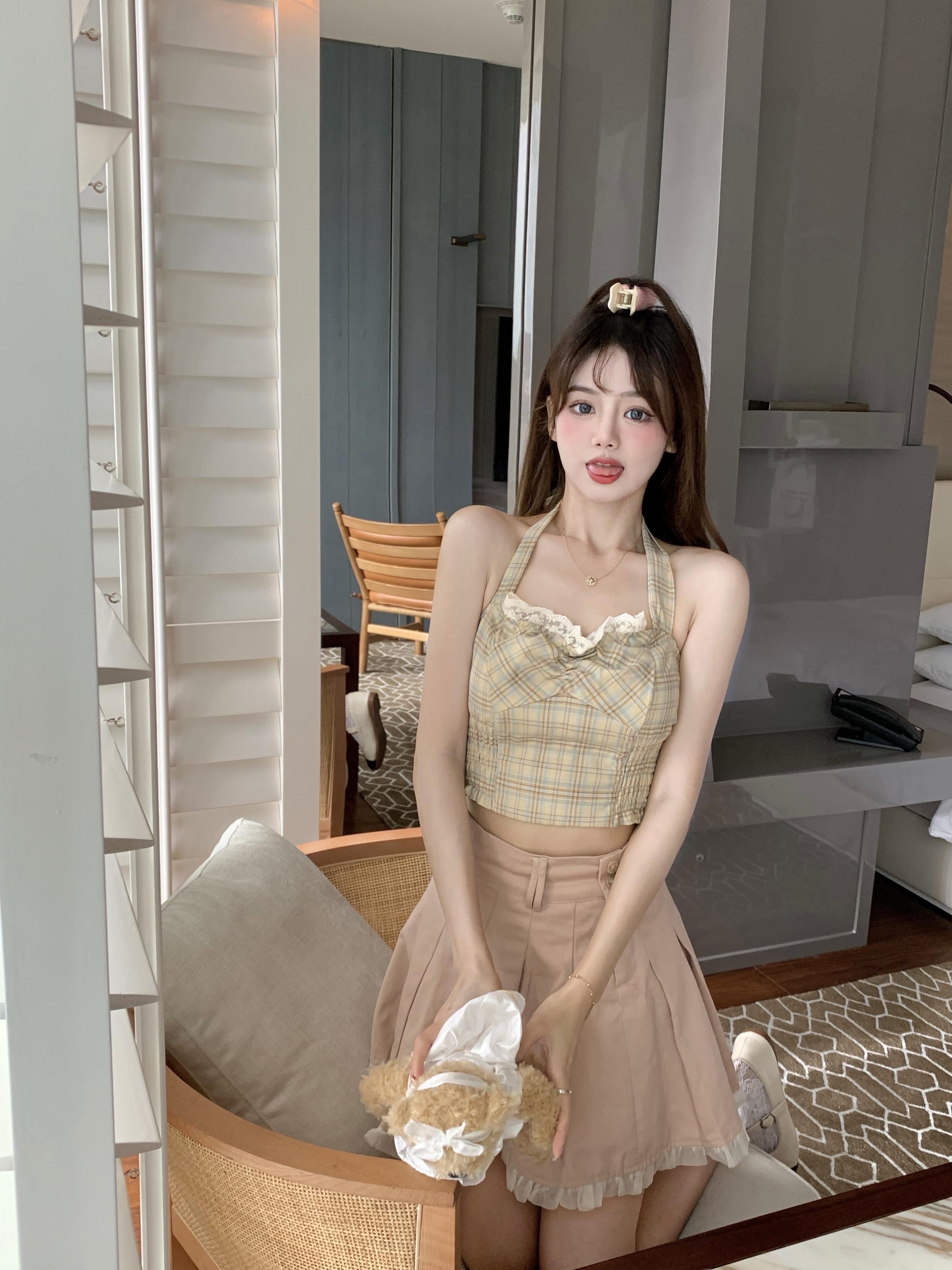 ブラックレース格子柄ホルタートップス ピュア ブラックストロベリース18345397980