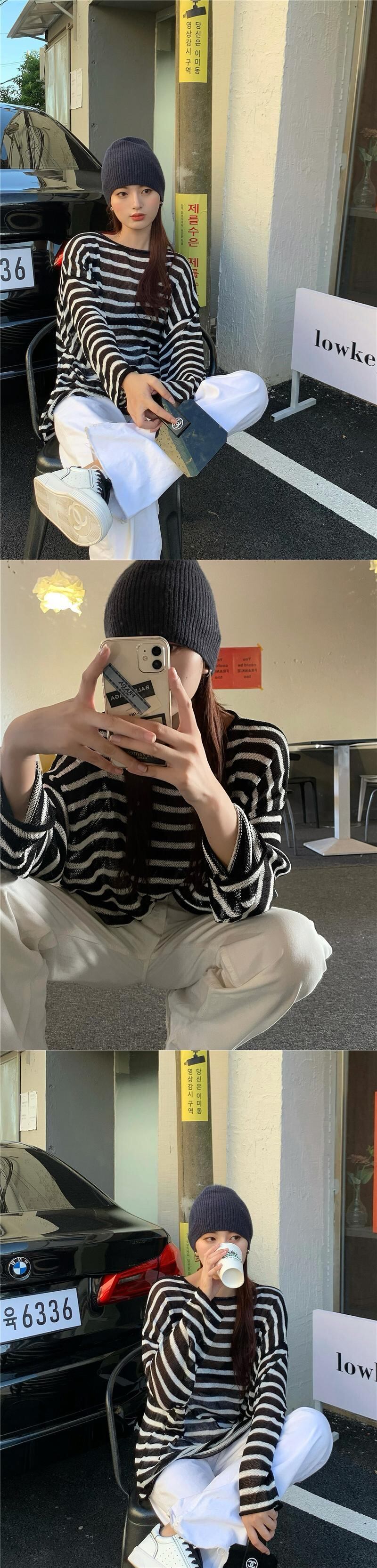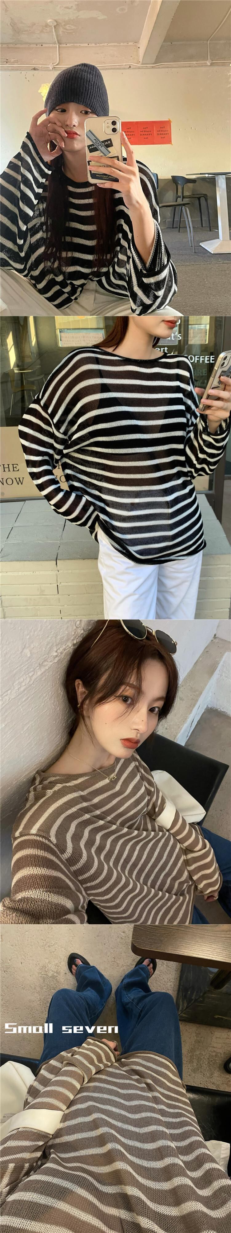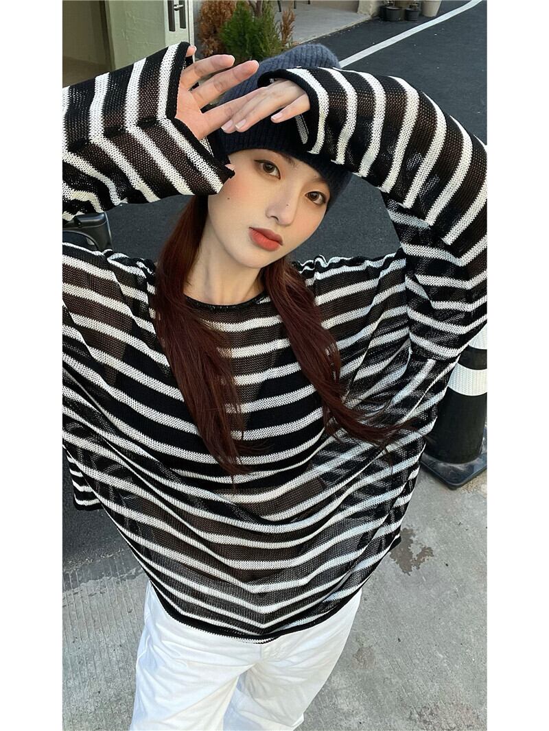 ストライプセーター レディースルーズ薄手ブラウス サマーブラックトップス ロング 夏物 シルク ブラックストロベリース52343740418