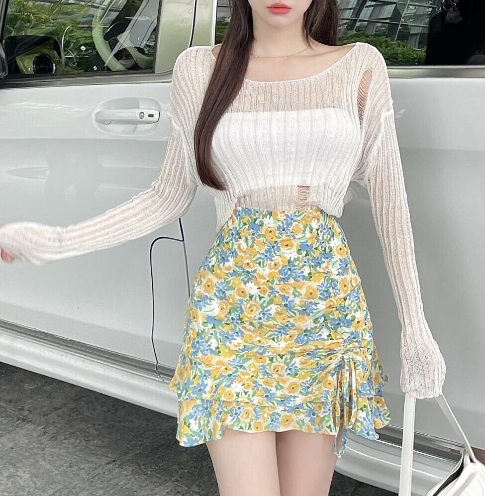 フローラルスカート ハイウェストウェストショートサマーAラインイエロー 夏物 花柄 ブラックストロベリース54680553173
