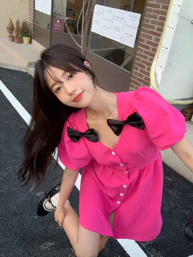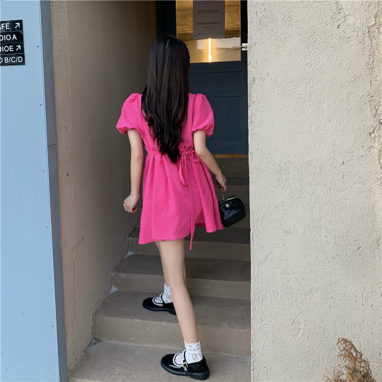 ブラックリボンドレス ウェスト薄手スリーブショートスカート レース 大人ガーリー スウィート キュート カジュアル レースアップ ブラックストロベリース61054845452