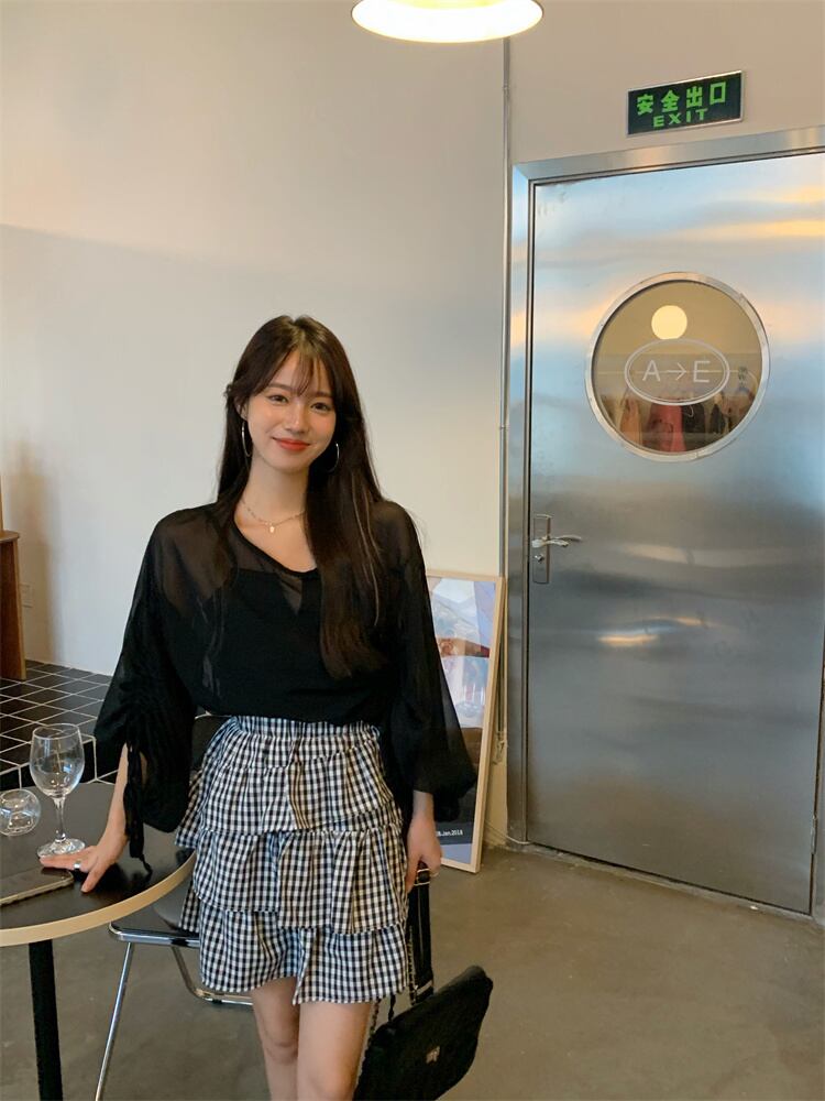 格子柄スカート 薄手ハイウェストウェストAラインショートサマースタイル 夏物 ブラックストロベリース24971520851