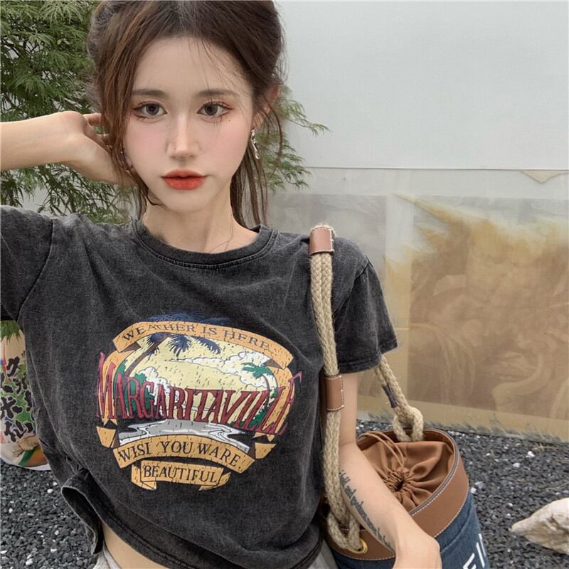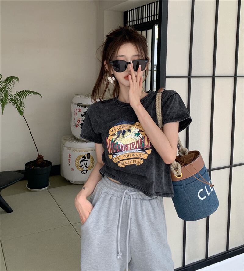 Tシャツ サマー薄手ショートハイウェストウェストルーズトップス 夏物 ブラックストロベリース97521705353