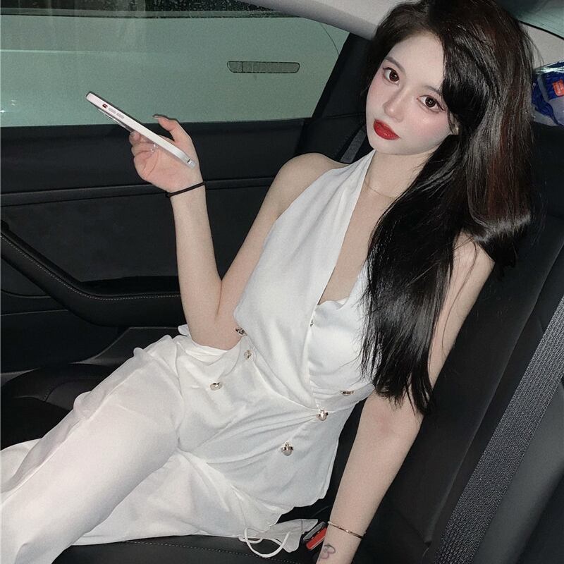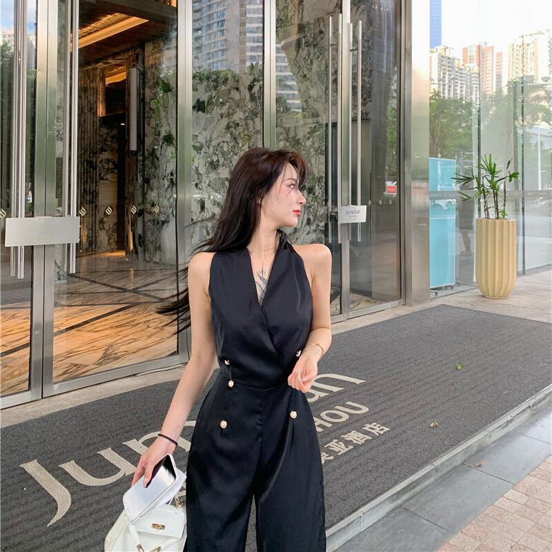 ジャンプスーツ オールインワン ハイウェストウェストブラックサマースタイル薄手パンツ レッド 夏物 ブラックストロベリース3200631767