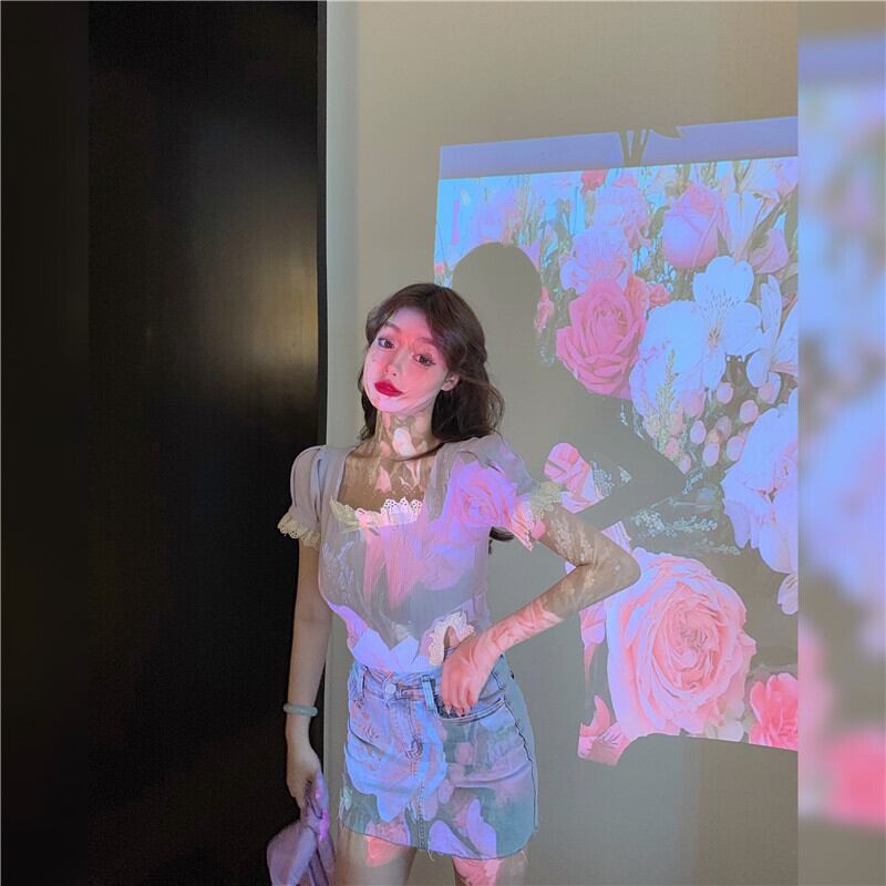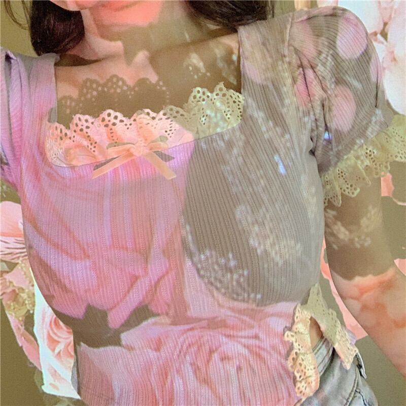 ニットセーター ショートレーススリーブトップス サマースタイル リボン 夏物 スクウェア ステッチ ブラックストロベリース57945796670