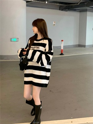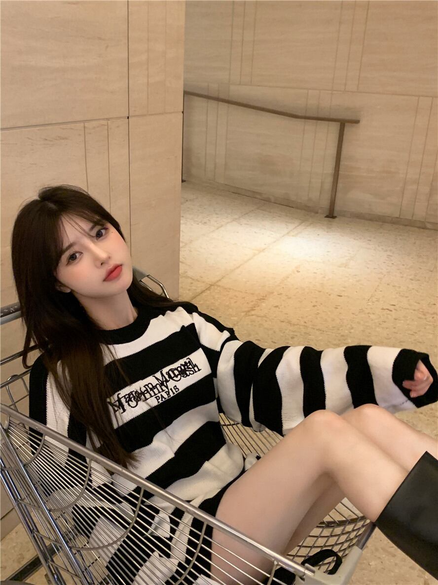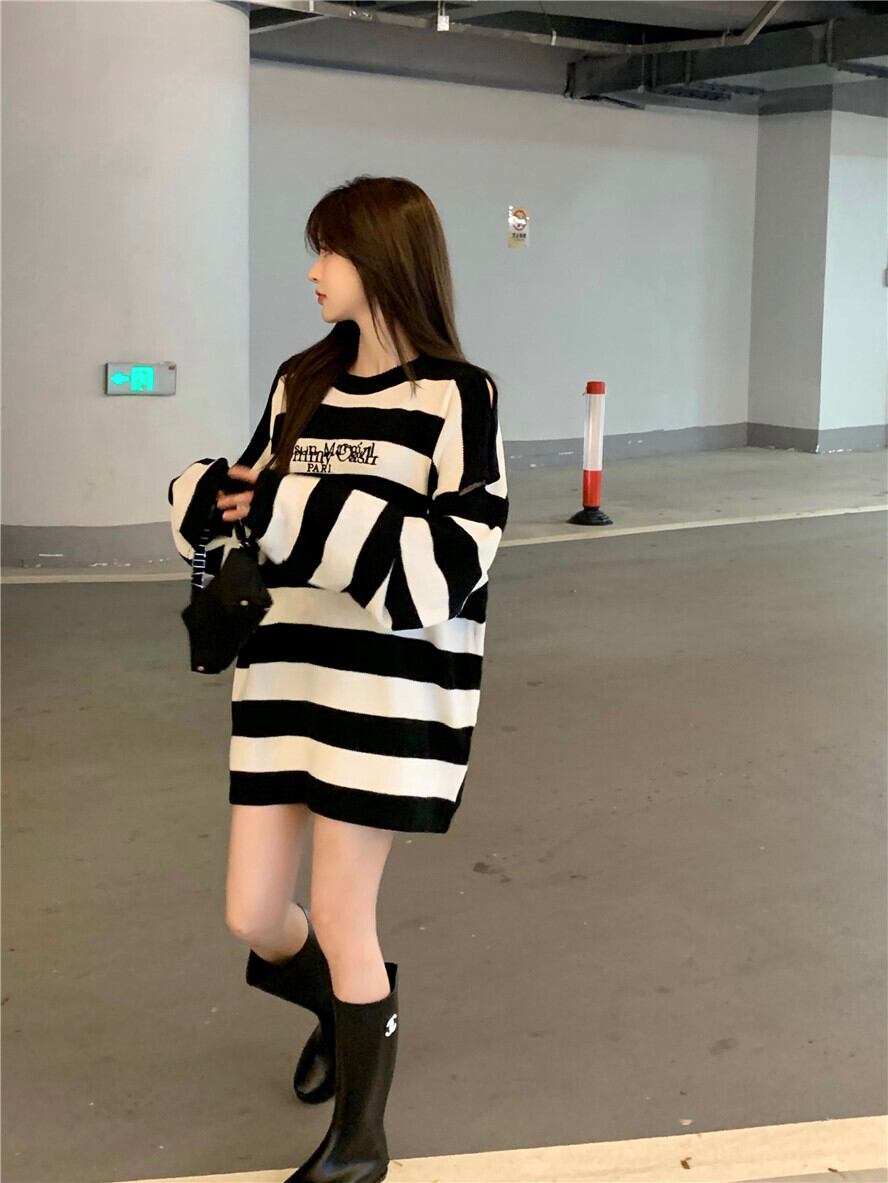 スタンダードストライプストラップレスセーター サマー薄手ルーズシャツ ロング レトロ 夏物 ヨーロピアン ブラックストロベリース28238829163