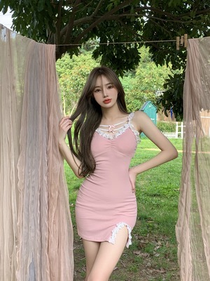 レースリボンドレス サマーショートスカート ピンク 夏物 ブラックストロベリース99898764428