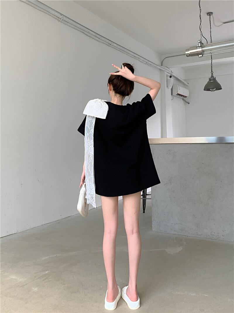 ブラックリボン半袖スリーブTシャツ トップス ショート ハーフスリーブ ブラックストロベリース47158028050