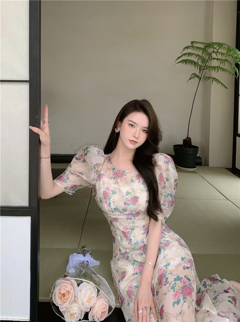 ブラックドレス スリーブウェストシフォンプリントスカート レディース ブラックストロベリース58156837841