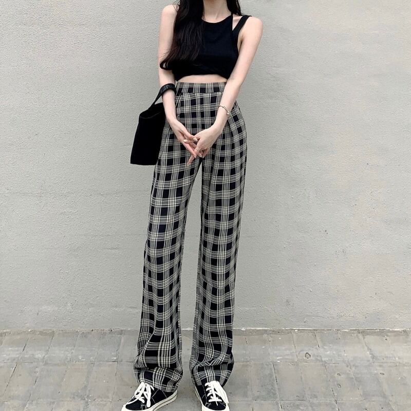格子柄カジュアルパンツ ハイウェストウェストルーズサマースタンダード薄手 レトロ 夏物 ブラックストロベリース3430005336