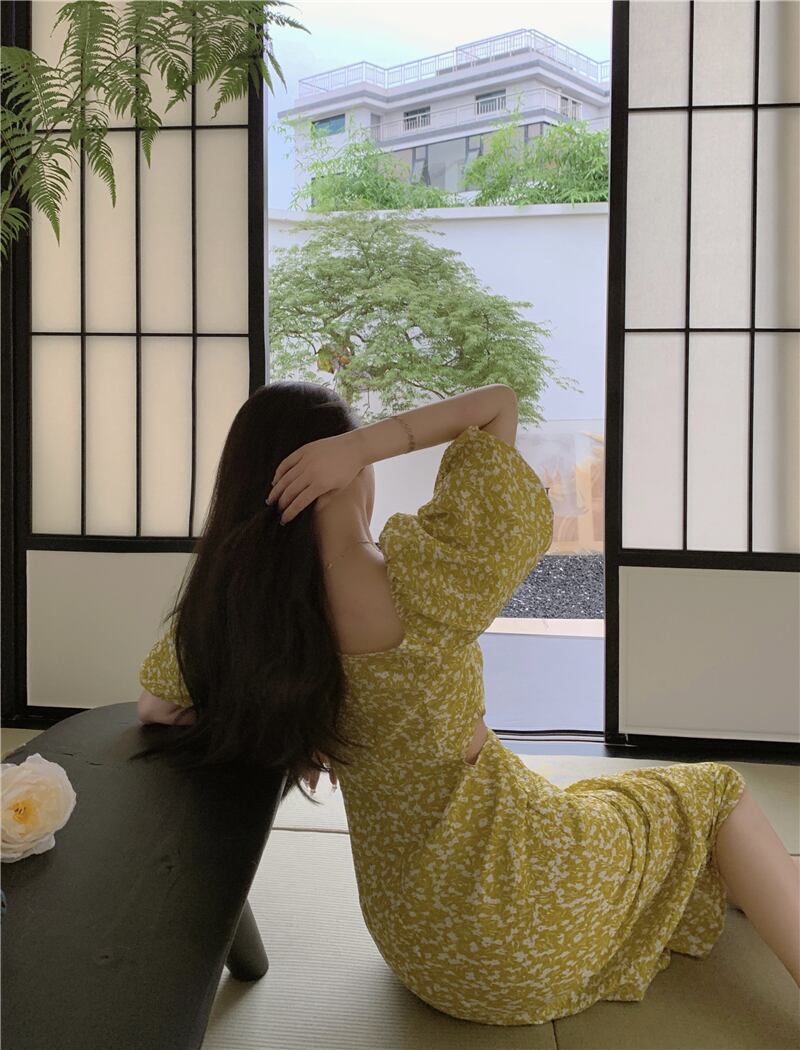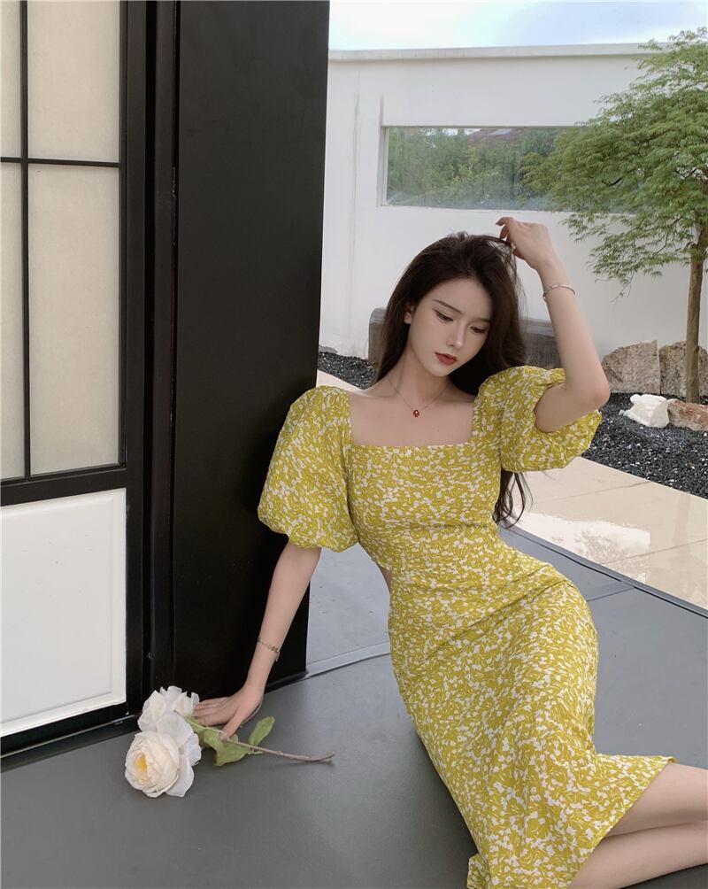 フローラルドレス スリーブスカート サマーウェストカラーイエロー 夏物 花柄 スクウェア ブラックストロベリース25877534612