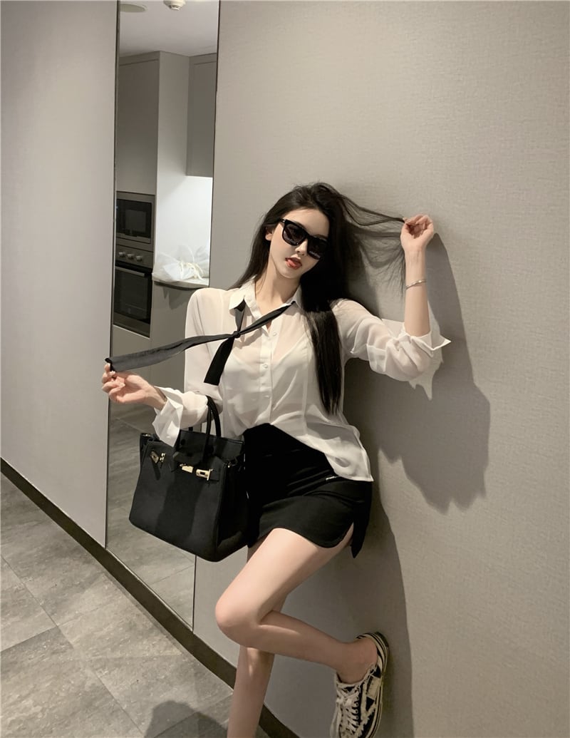 シャツ ルーズ薄手サマーホワイトトップス ロング 夏物 ブラックストロベリース39983510831