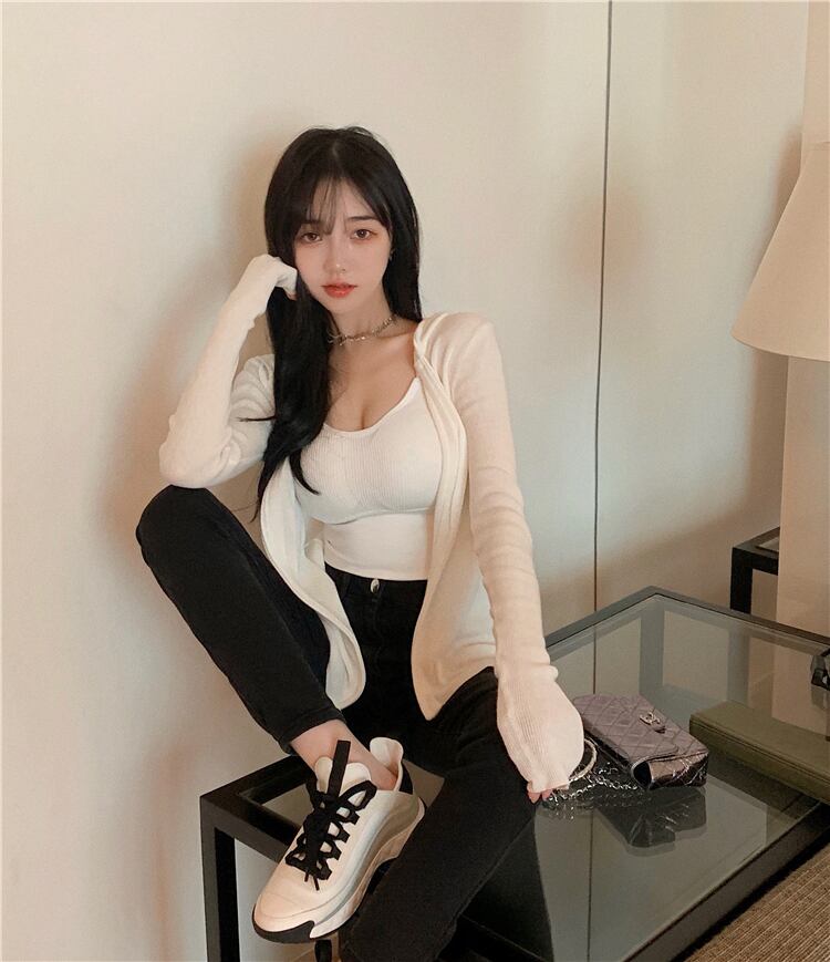 ニットカーディガンジャケット フードジッパー薄手サマー長袖スリーブトップス ロング 夏物 シルク ブラックストロベリース48201180607