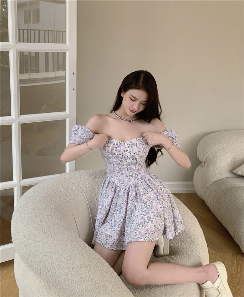 フローラルドレス スリーブショートスカート サマーカラー 夏物 花柄 パープル スクウェア ブラックストロベリース51419708692