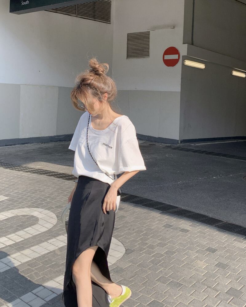 サテンスリットスカート サマー薄手ウェスト 夏物 ブラックストロベリース87690562882