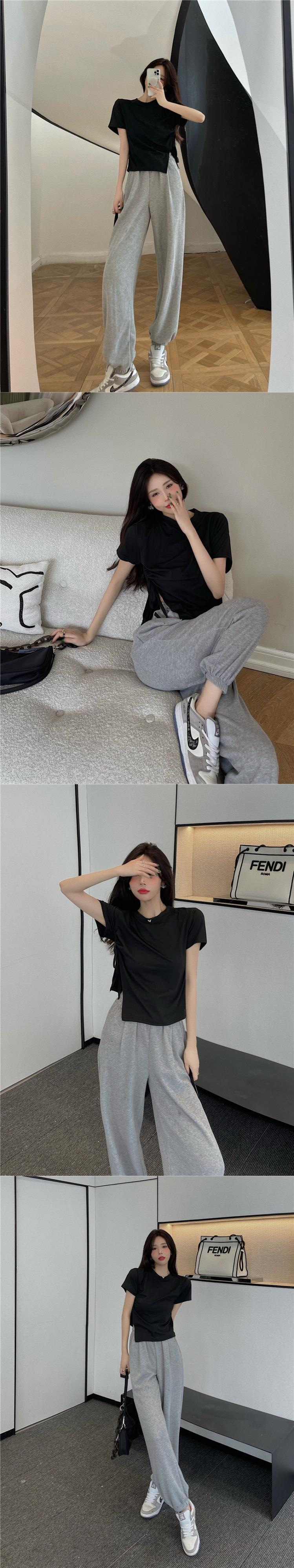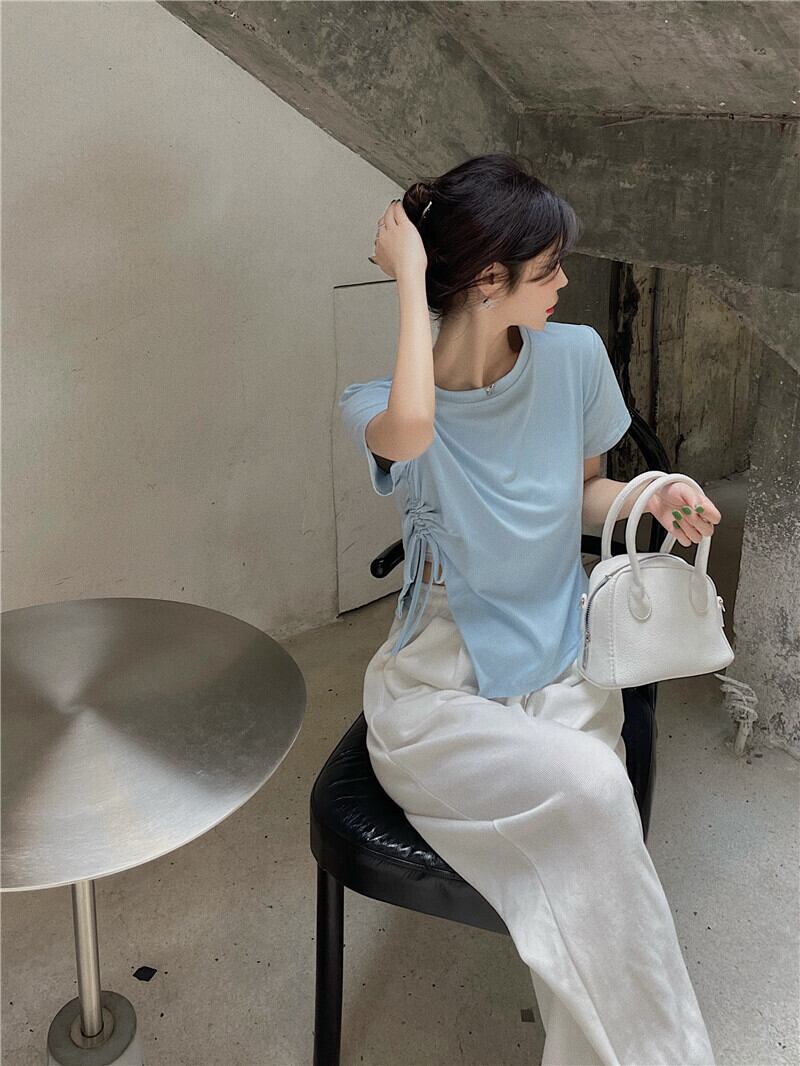 色:青いTシャツ,黒いTシャツ,ダークグレーのTシャツ,白いズボン,黒いズボン,グレーのズボン