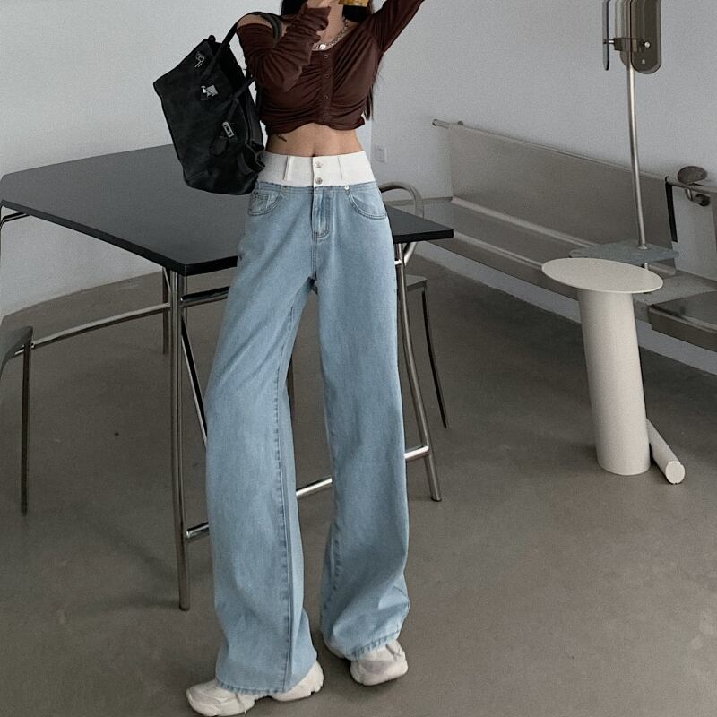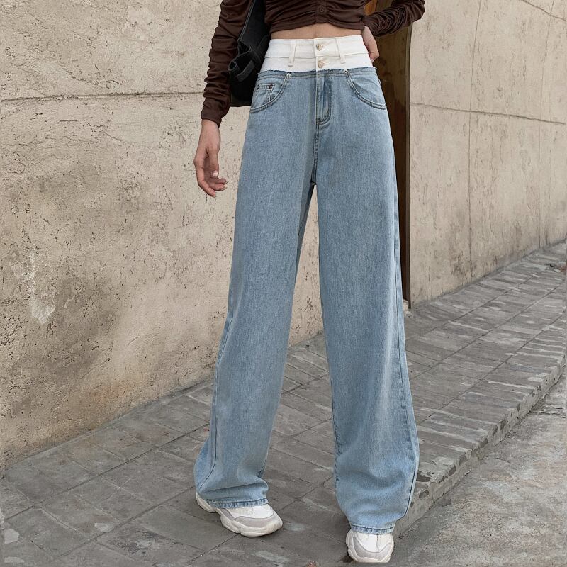 ジーンズ ルーズサマーハイウェストウェスト薄手ワイドレッグパンツ 夏物 ワイドパンツ ステッチ ブラックストロベリース73778232054