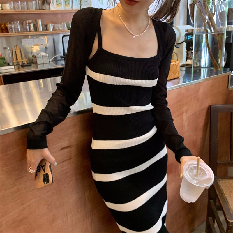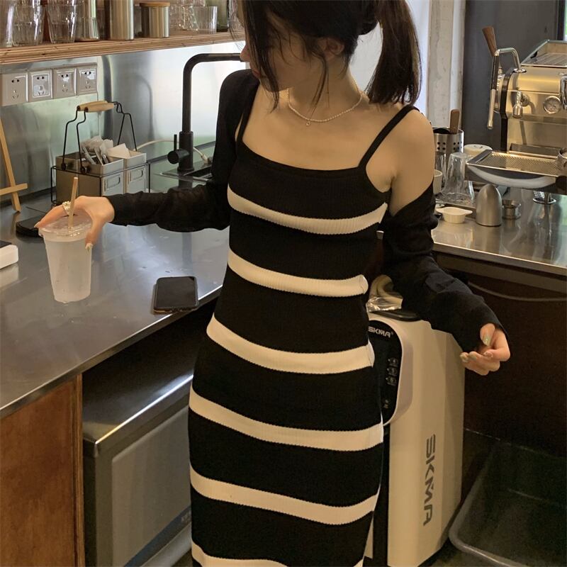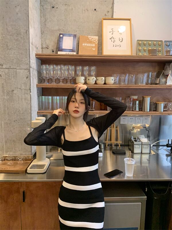 ストライプニットドレス ウェストロングスカート サマーブラック 夏物 ブラックストロベリース71090989891