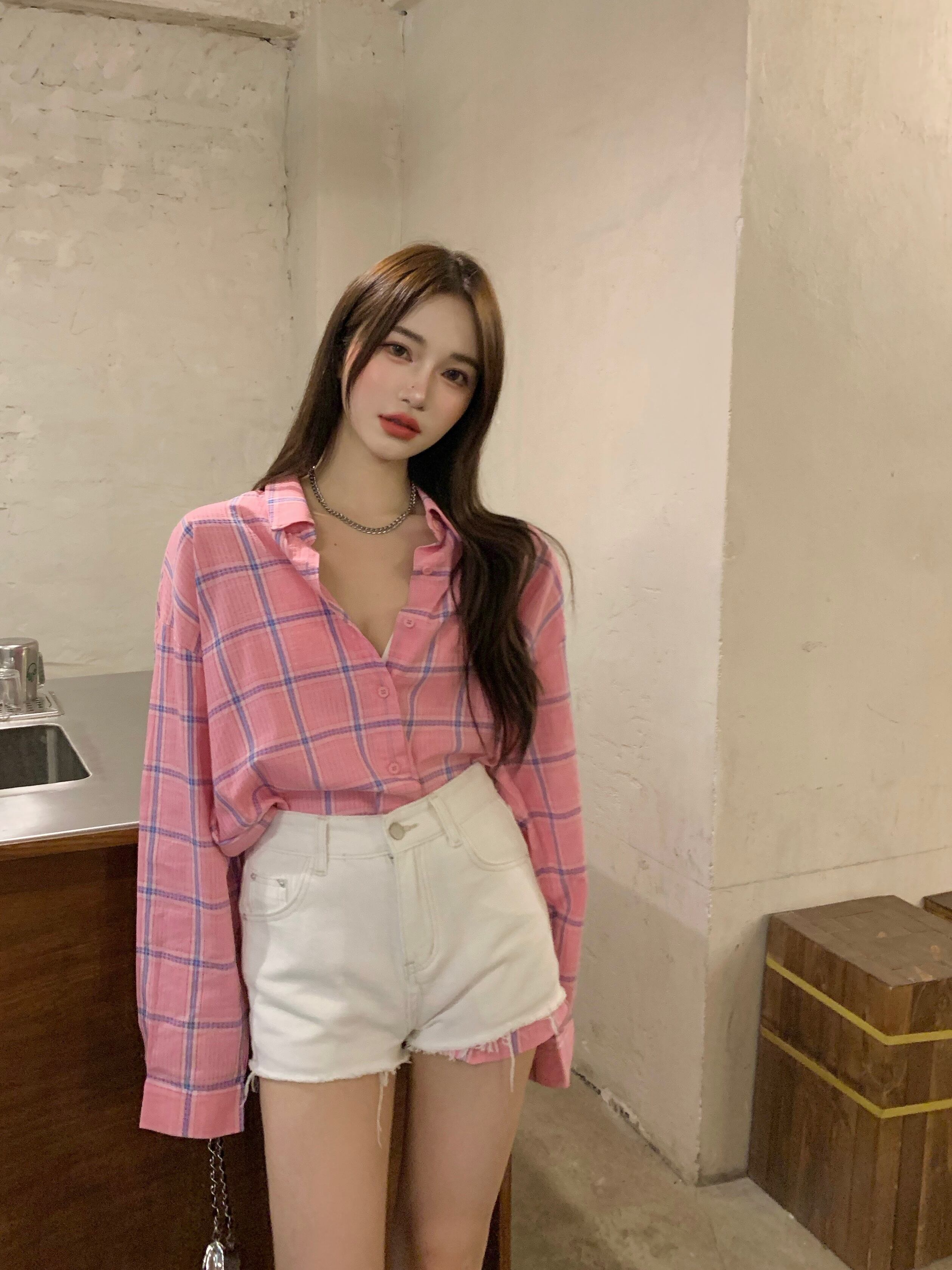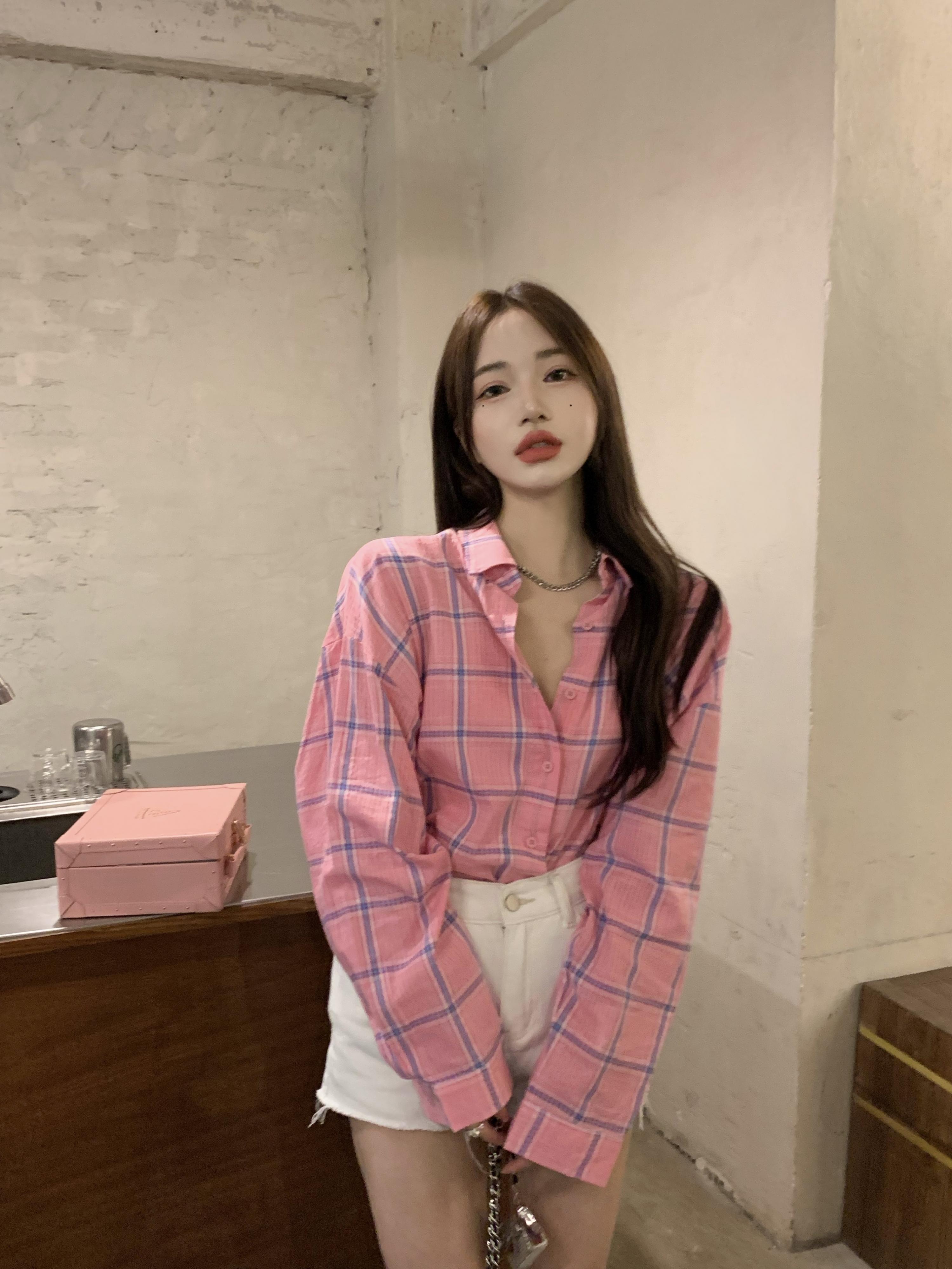 格子柄シャツ ルーズサマー薄手トップス ロング ピンク 夏物 ブラックストロベリース84967870184