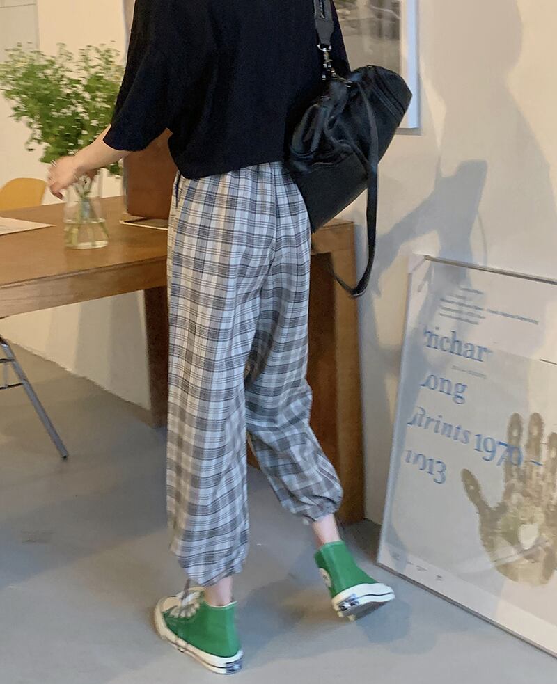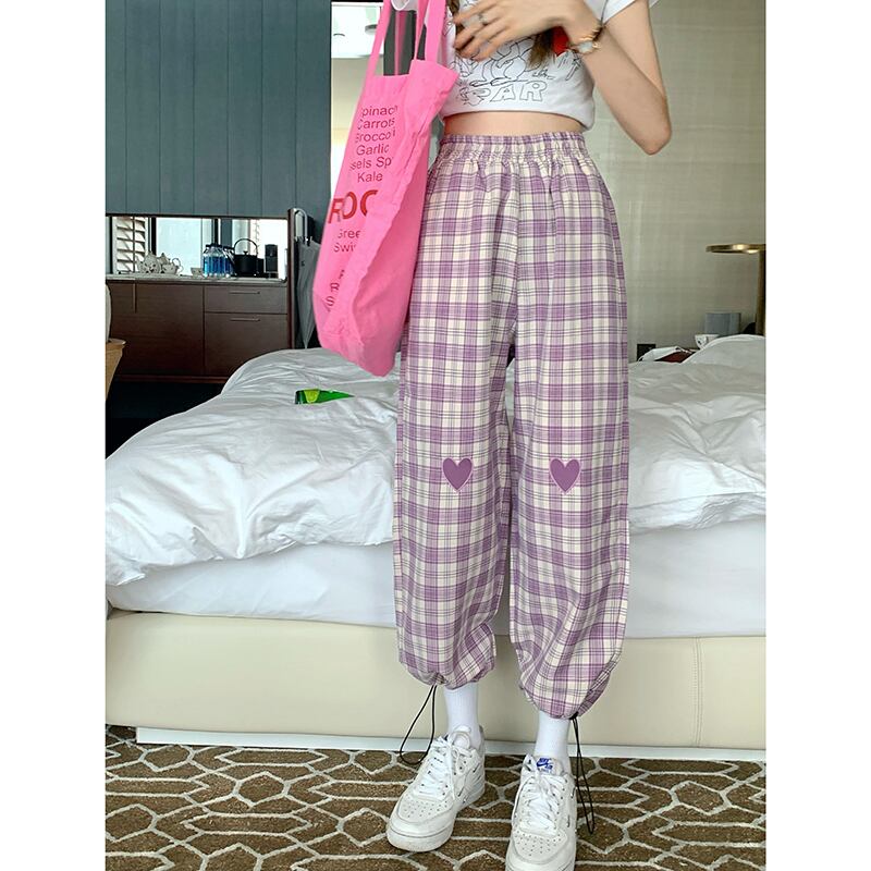 格子柄パンツ ルーズウェストギャザーサマー薄手 夏物 ワイドレッグ ワイドパンツ パープル ブラックストロベリース82510916337