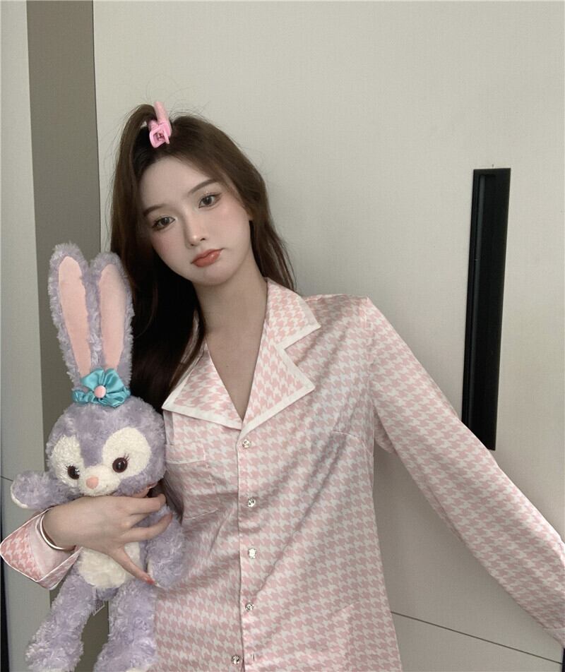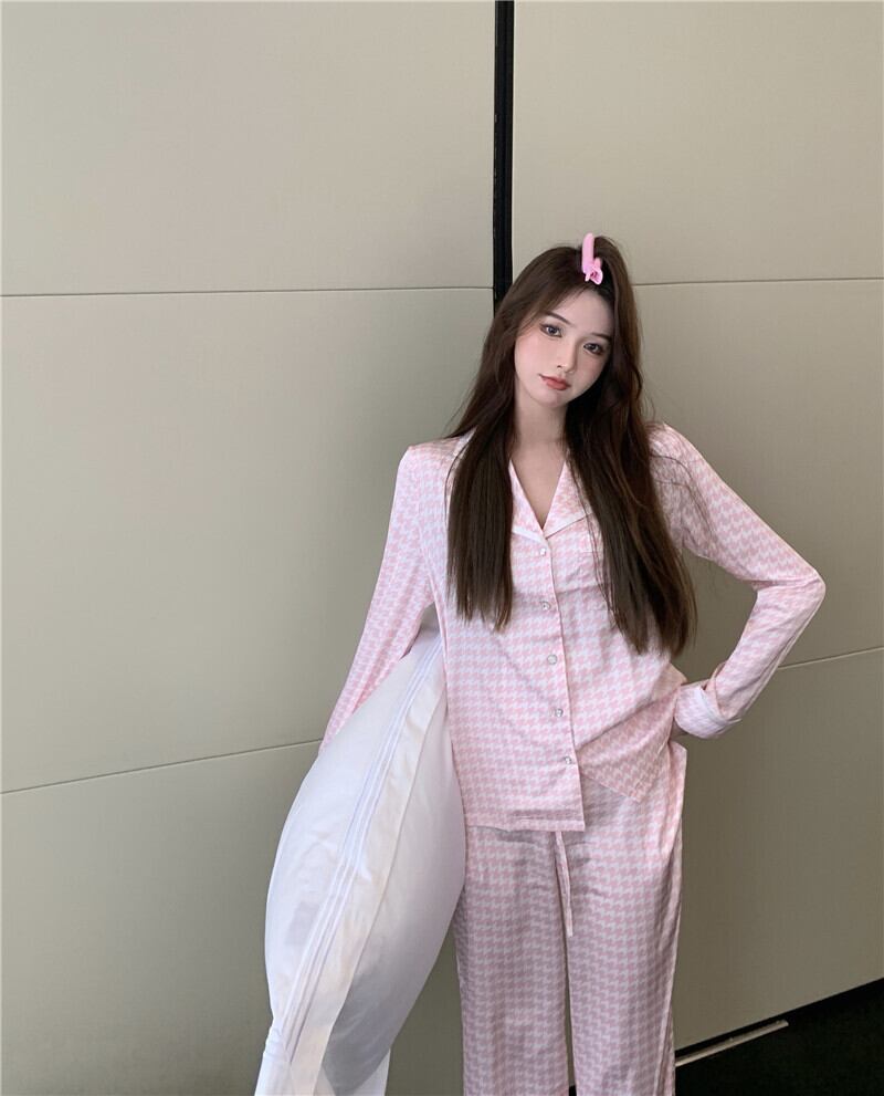 格子柄レディースサマーカジュアル薄手パンツ セット ピンク 夏物 ブラックストロベリース84189832434